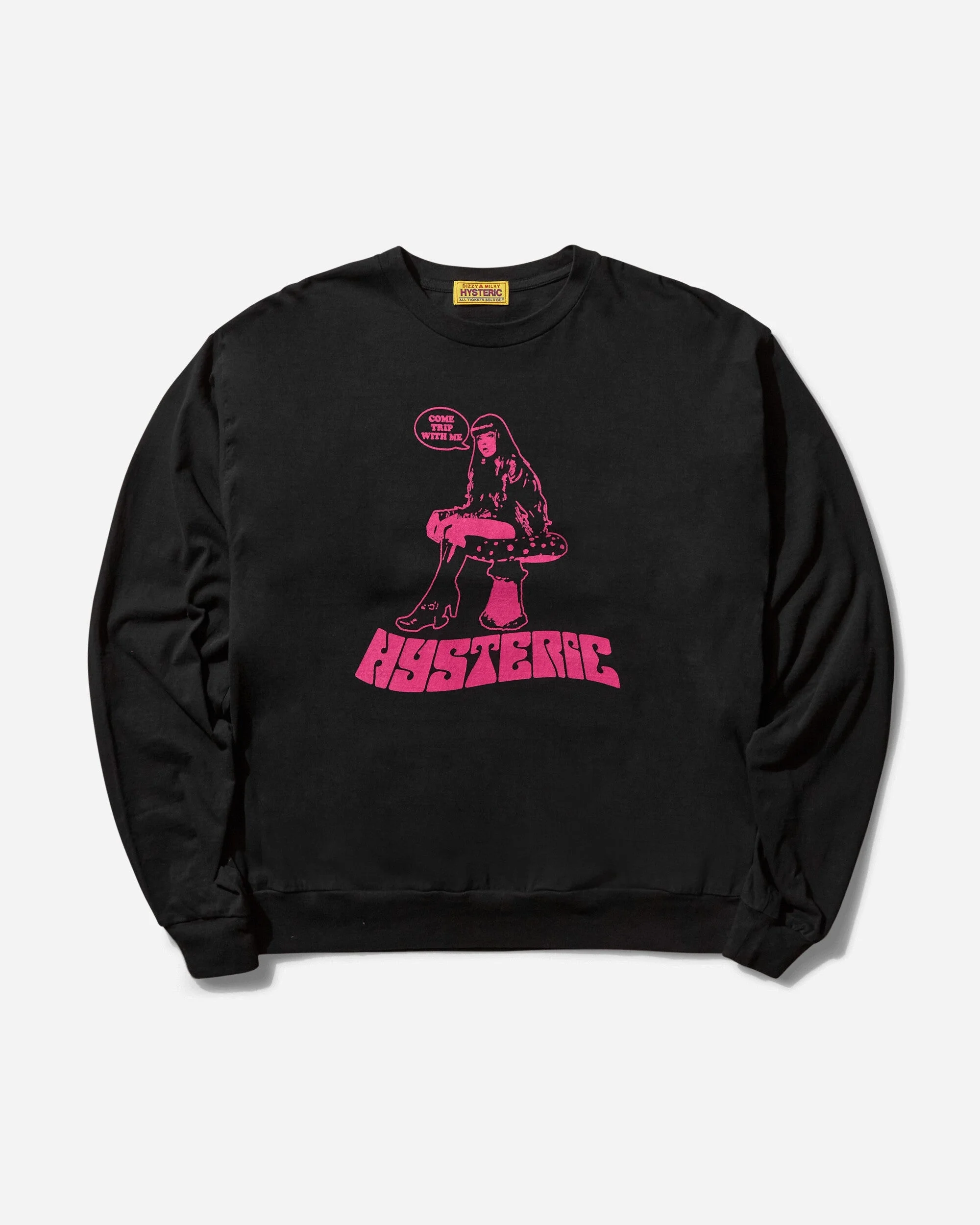 Hysteric Glamour Come Trip With Me Crewneck Sweatshirt Black Hysteric Glamour is a Japanese brand known for its bold and provocative aesthetic, that combines elements of rock 'n' roll, pop culture, and contemporary art. The collections frequently feature vibrant prints, extravagant graphics, and unique details. The brand has gained significant popularity in the Japanese fashion scene and has also garnered an international following. - 100% Cotton - Relaxed Fit - Ribbed Crewneck, Cuffs and Hem - Graphic Printed at Front - Made in Japan - Style Code: CL119 B
