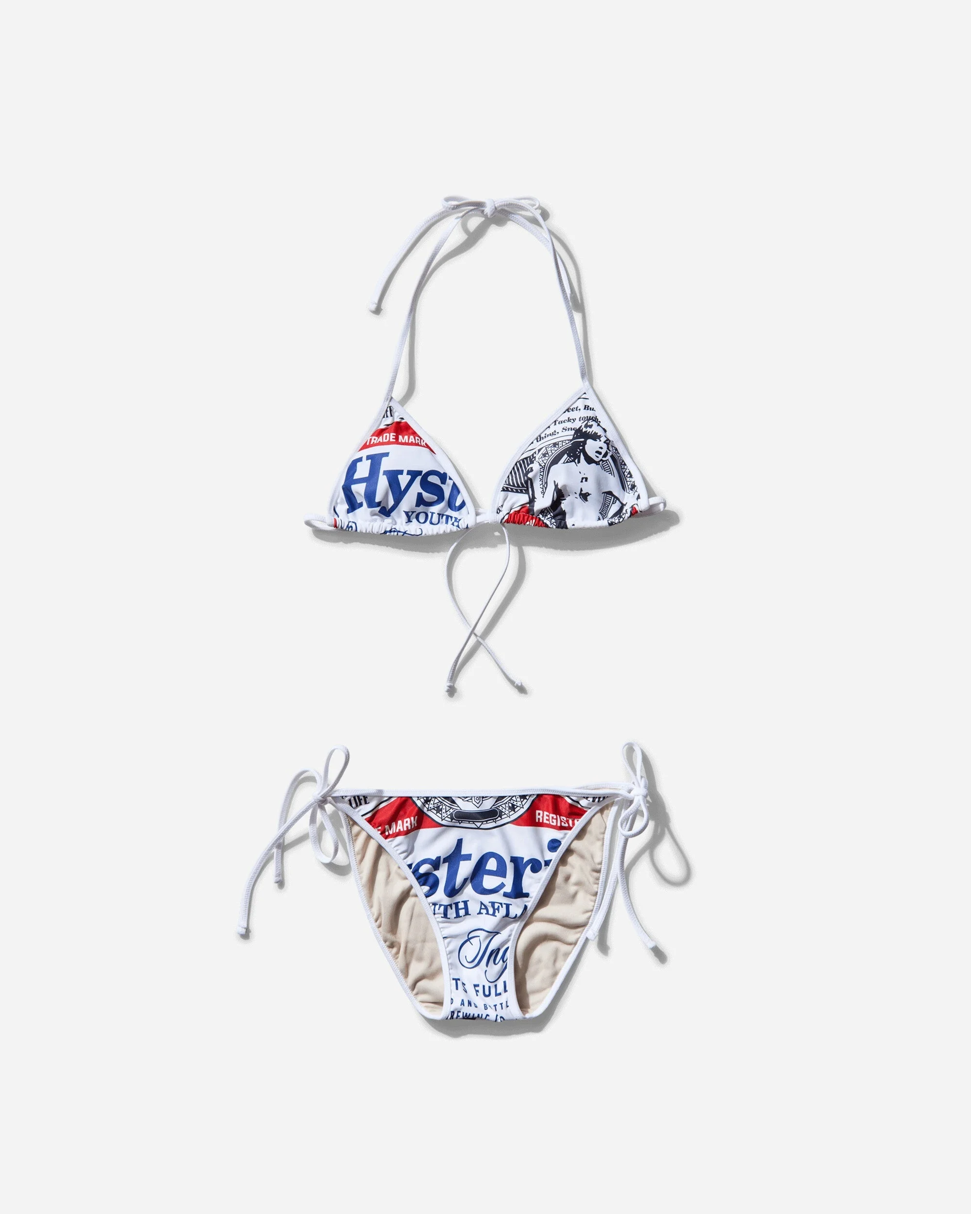 Hysteric Glamour HG Label Bikini White A bikini with an all-over pattern design that incorporates the brand's basic elements, such as American corporate logos, culture, and sexy girls. - 82% Polyester, 12% Polyurethane - Two-Piece Set - All-Over Printed Pattern - Lace Closure - Cut-Out Details - Made in Japan - Style Code: 01251QM02 0