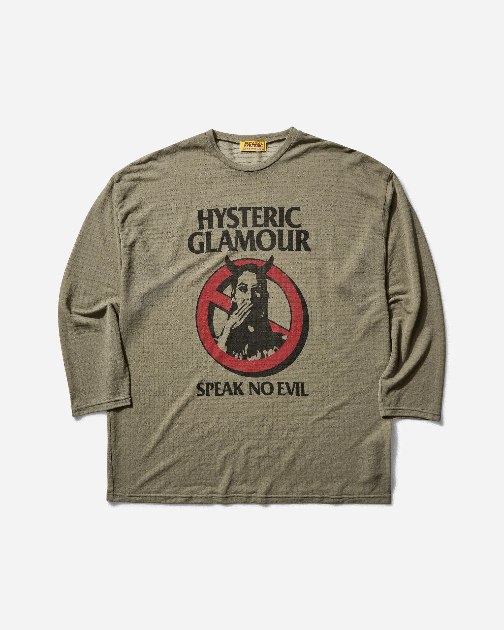 Hysteric Glamour Warning Evil One-Piece Top Khaki This t-shirt / dress features an oversized fit and it's crafted of thin sheer material is made of lightweight fabric with a smooth texture. - 70% Cotton, 30% Nylon - Lightweight Sheer Fabric - Oversized Fit - Bonded Collar - Graphic Printed at Front - Made in Japan - Style Code: 01251CO02 65 SIZE & FIT Size Body Chest Sleeve One Size 78cm 66cm 53cm