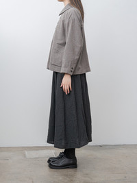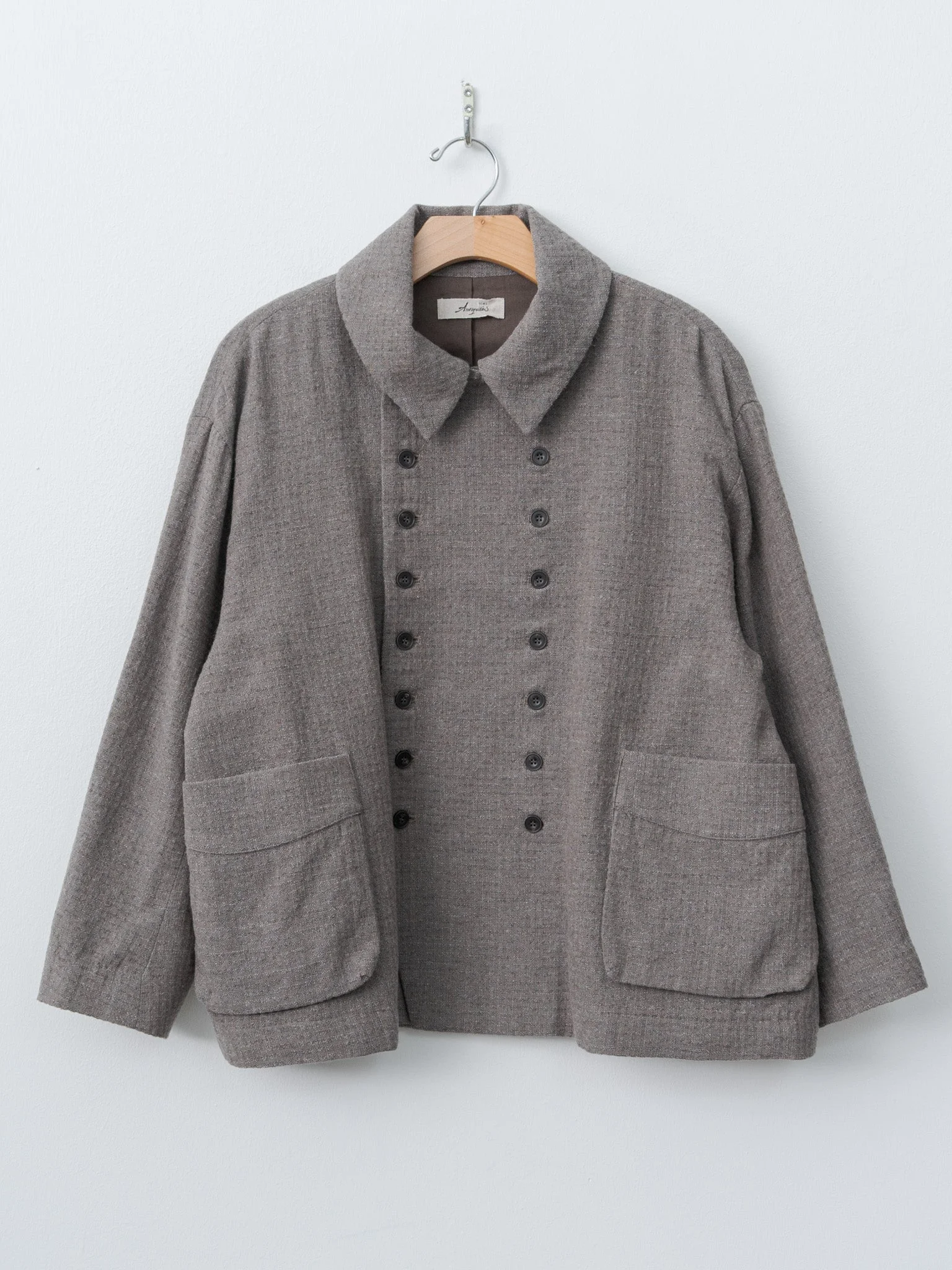 A softly structured jacket crafted from cotton wool seersucker. The fabric has a subtle puckered texture that creates gentle volume and breathability, balanced by the wool’s natural warmth. Details include a double-breasted front, small rounded collar, and dropped shoulders, curved front patch pockets, buttoned cuffs and cotton lining. - Made in Vietnam - 63% Cotton, 27% Wool, 8% Polyester, 1% Acrylic, 1% Nylon - Available in Mocha, Charcoal - The model is 5'8"/173cm and wears the One Size