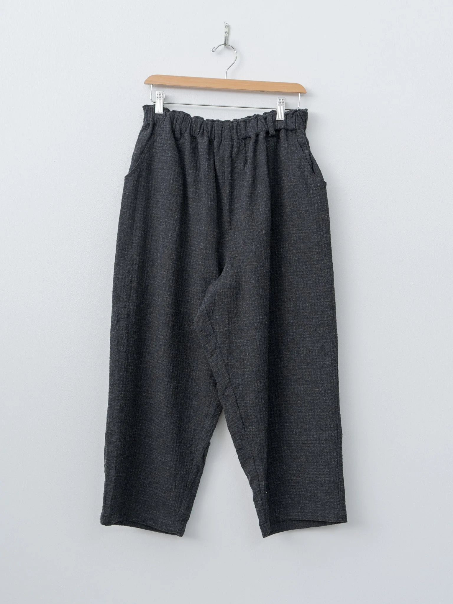 A cropped wide leg trouser from Ichi Antiquites in a cotton wool seersucker - it feels lightweight yet warm with a slight crinkle texture. Details include an elasticated waist with inner drawstrings and belt loops, side pockets and large patch pockets on the back. The fit is wide throughout the legs with a gentle taper. - Made in Vietnam - 63% Cotton, 27% Wool, 8% Polyester, 1% Acrylic, 1% Nylon - Available in Mocha, Charcoal - The model is 5'8"/173cm and wears the One Size