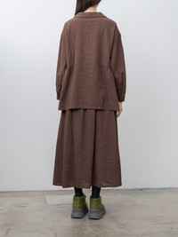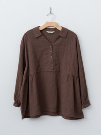 A pullover shirt crafted from a lightweight linen–cotton blend with a subtle mini houndstooth, offering a gently textured, breathable feel. Details include a shallow open collar with a short button placket, dropped shoulders, long sleeves with softly gathered cuffs, and a wide, subtle A-line silhouette. - Made in Japan - 55% Linen, 45% Cotton - Available in Brown, Charcoal - The model is 5'8"/173cm and wears the One Size