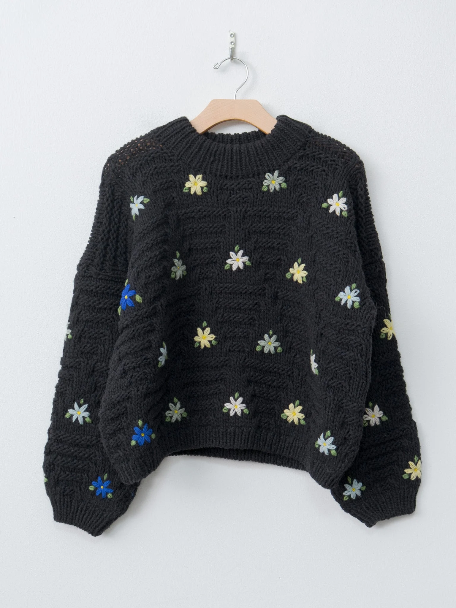 A hand-knit sweater crafted in Peru featuring a chunky textured stitch and one-of-a-kind all over floral embroidery. The knit has a relaxed silhouette with a slightly cropped length and voluminous arms. Details include a rounded neckline, dropped shoulders and ribbing at the collar, cuffs and hem. - Made in Peru - 100% Wool - Available in Black - The model is 5'8"/173 cm and wears the One Size
