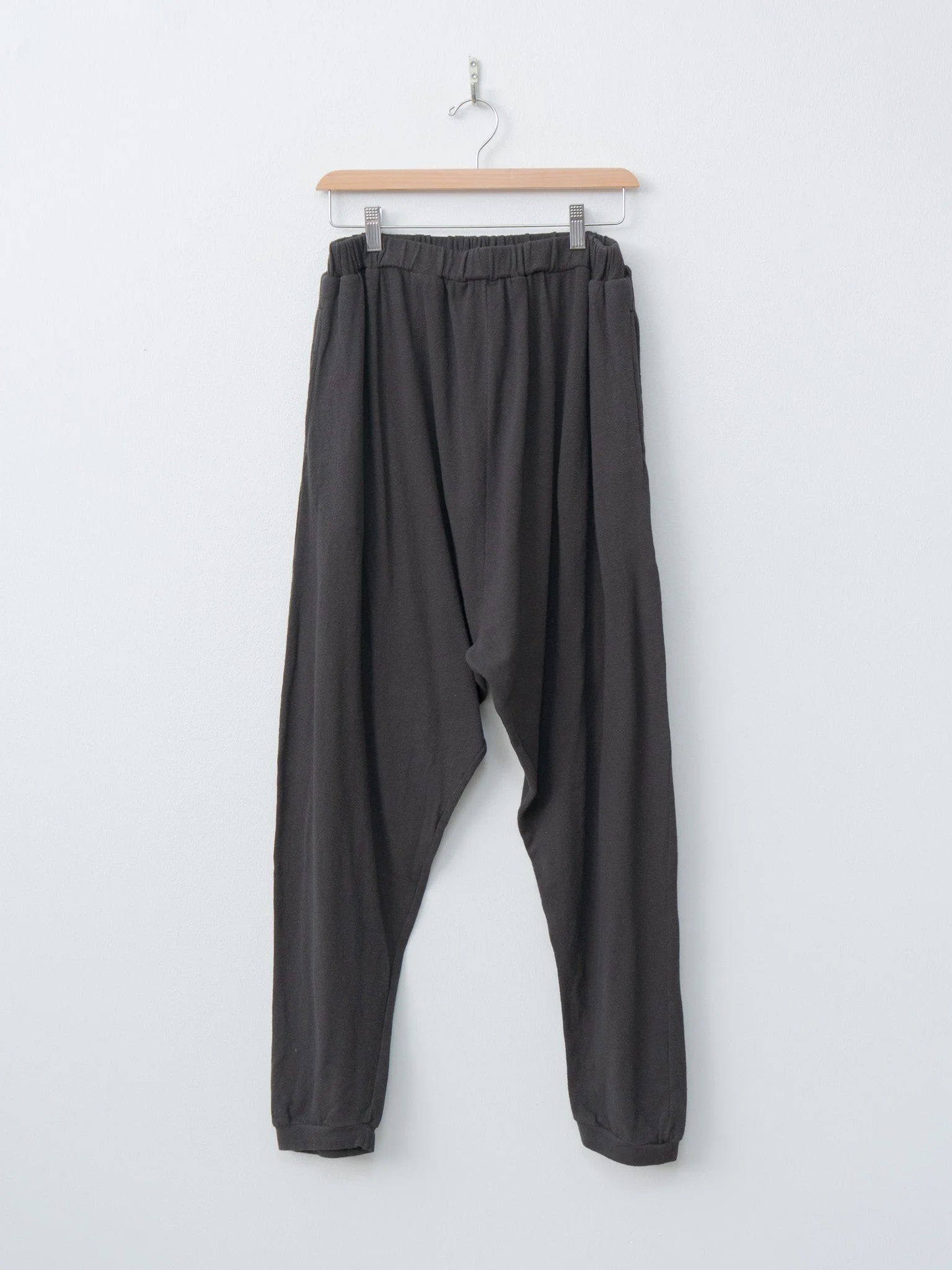A drop crotch jogger made from a midweight cotton jersey with a hint of stretch and slubby texture. It features an elasticated waistband, side seam pockets and a tapered hem. - Made in Japan - 98% Cotton, 2% Polyurethane - Available in Black - The model is 5'8"/173 cm and wears the One Size