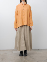A lightweight wool–cotton gingham shirt with a soft, textured hand and a relaxed drape. It features a slightly asymmetric hem, a small pointed collar, dropped shoulders and buttoned front and cuffs. Relaxed fit. - Made in Japan - 63% Wool, 37% Cotton - Available in Orange x Mocha, Pink x Blue, Yellow x Gray - The model is 5'8"/173 cm and wears the One Size