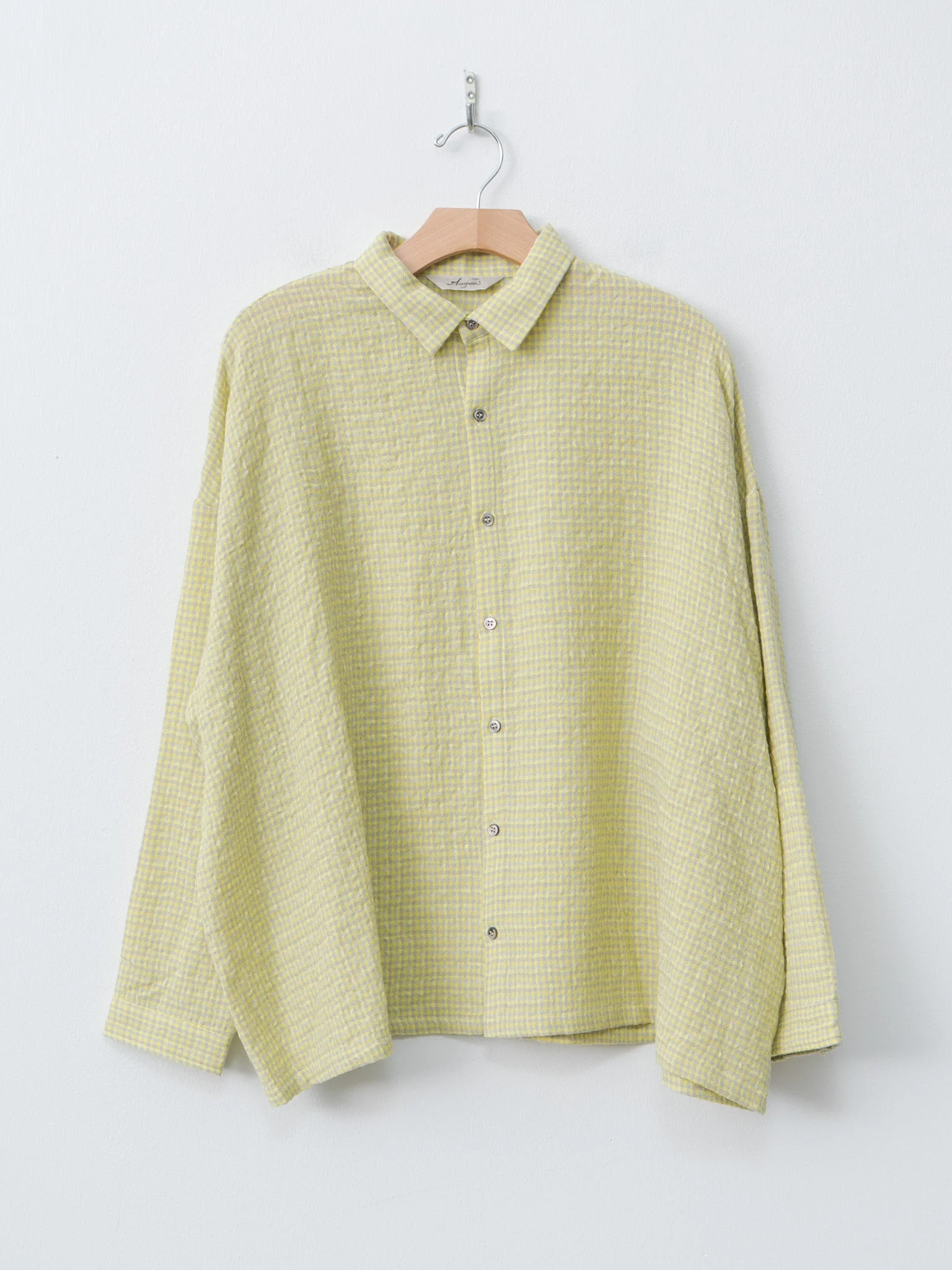 A lightweight wool–cotton gingham shirt with a soft, textured hand and a relaxed drape. It features a slightly asymmetric hem, a small pointed collar, dropped shoulders and buttoned front and cuffs. Relaxed fit. - Made in Japan - 63% Wool, 37% Cotton - Available in Orange x Mocha, Pink x Blue, Yellow x Gray - The model is 5'8"/173 cm and wears the One Size