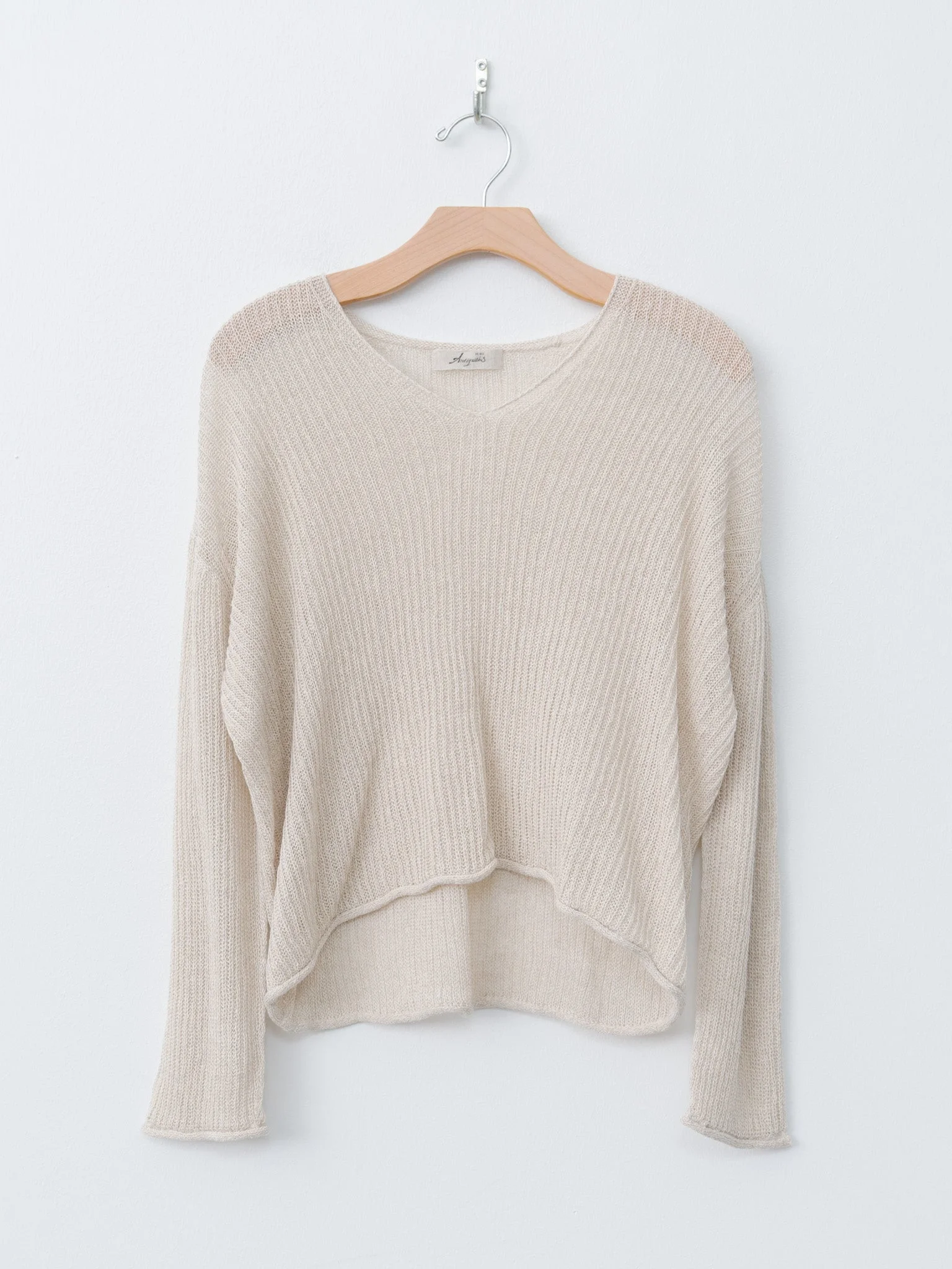 A ribbed v-neck pullover sweater made in a lightweight, sheer cotton/linen blend. It features a wholegarment knit, made as a single seamless piece, a wide, cropped fit and rolled edges. We recommend it over tees and dresses as a warm weather layer. - Made in Japan - Cotton 52%, Linen 48% - Available in Natural - The model is 5'7"/170cm and wears the One Size