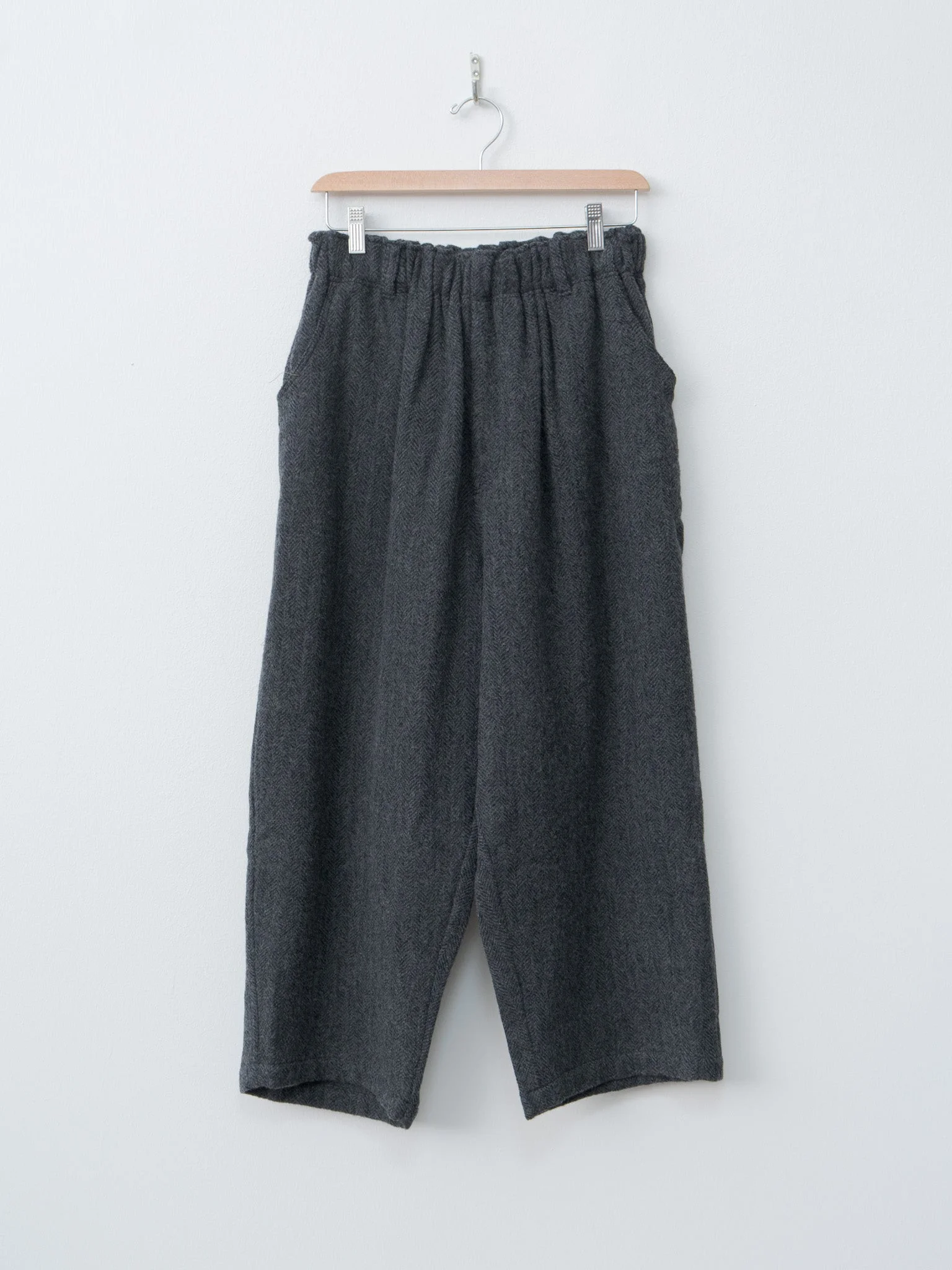 A cropped wide leg trouser from Ichi Antiquites in a beautiful wool herringbone. Details include an elasticated waist with inner drawstrings and belt loops, side pockets and large patch pockets on the back. The fit is wide throughout the legs with a gentle taper. - 100% Wool - Available in Brown, Black - The model is 5'8"/173 cm and wears the One Size