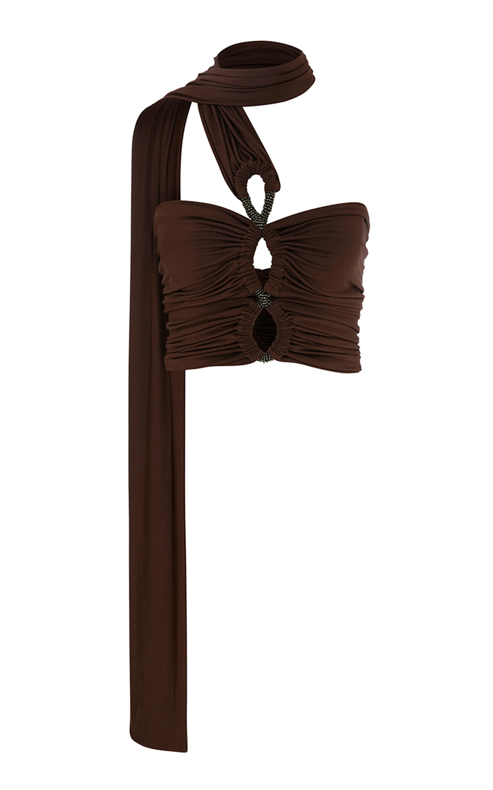 PRODUCT DETAILS - Slim fit, asymmetric neckline, keyhole cutout detailing, cropped silhouette - Pull On - Lined - Composition: 93% POLYESTER 7% ELASTANE - Color: BROWN - Dry Clean Only - Resort '26