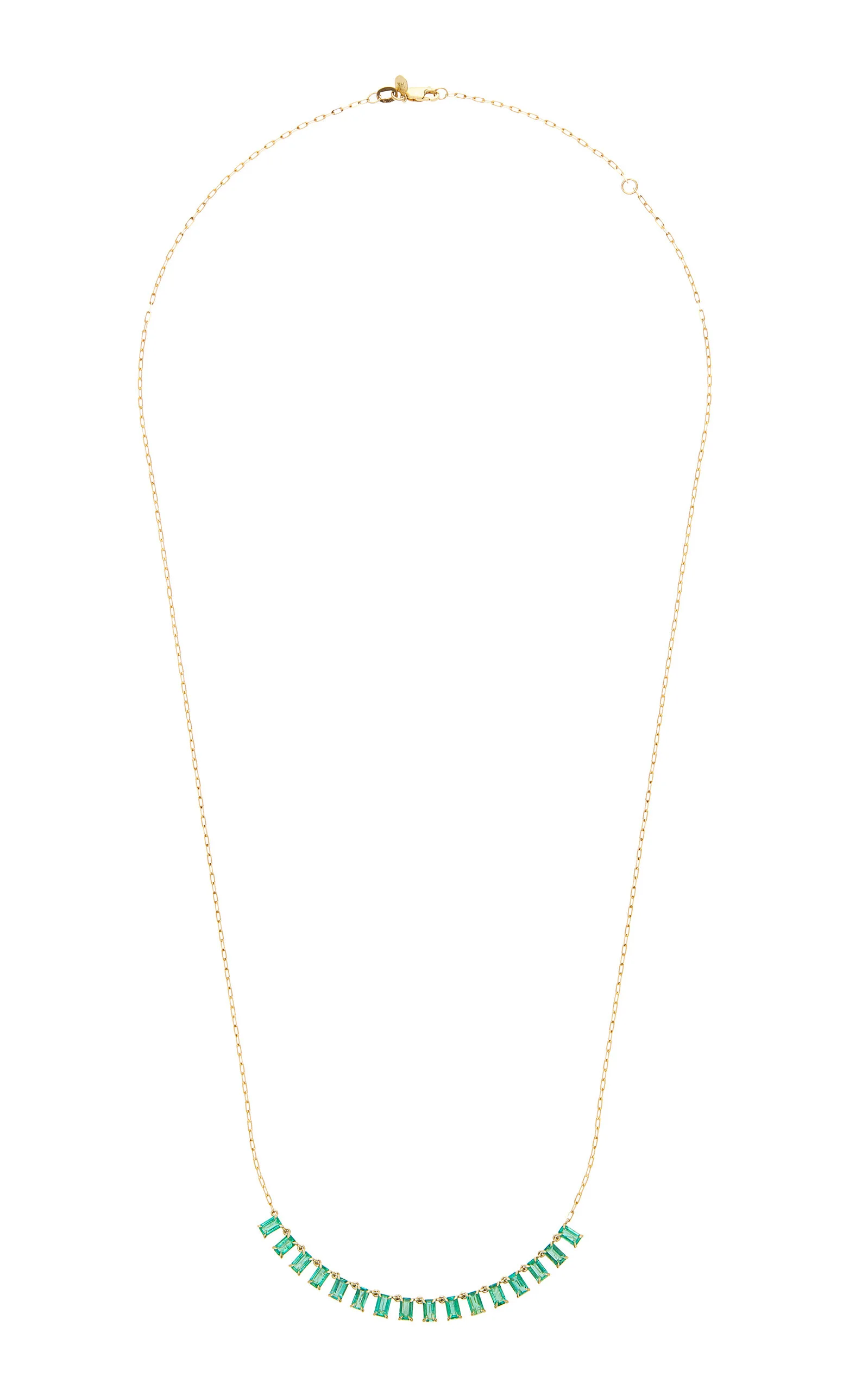 The designer's behind ILA trace their roots in jewelry back to their ancestral homeland in the north western deserts of India — a place enchanted by history, mysticism and beauty and is where the edifices of their family lineage still stand today. Carved with the most skilled hand, each piece tells the stories of mythology of the land. PRODUCT DETAILS - Not eligible for expedited shipping - Lobster clasp fastening - Composition: 14k yellow gold, 16 emeralds - Made in the USA - Please note the possibility of natural inclusions in gemstones SIZE & FIT - This item measures approximately emerald 0.020 x 0.12" each, 24" chain length