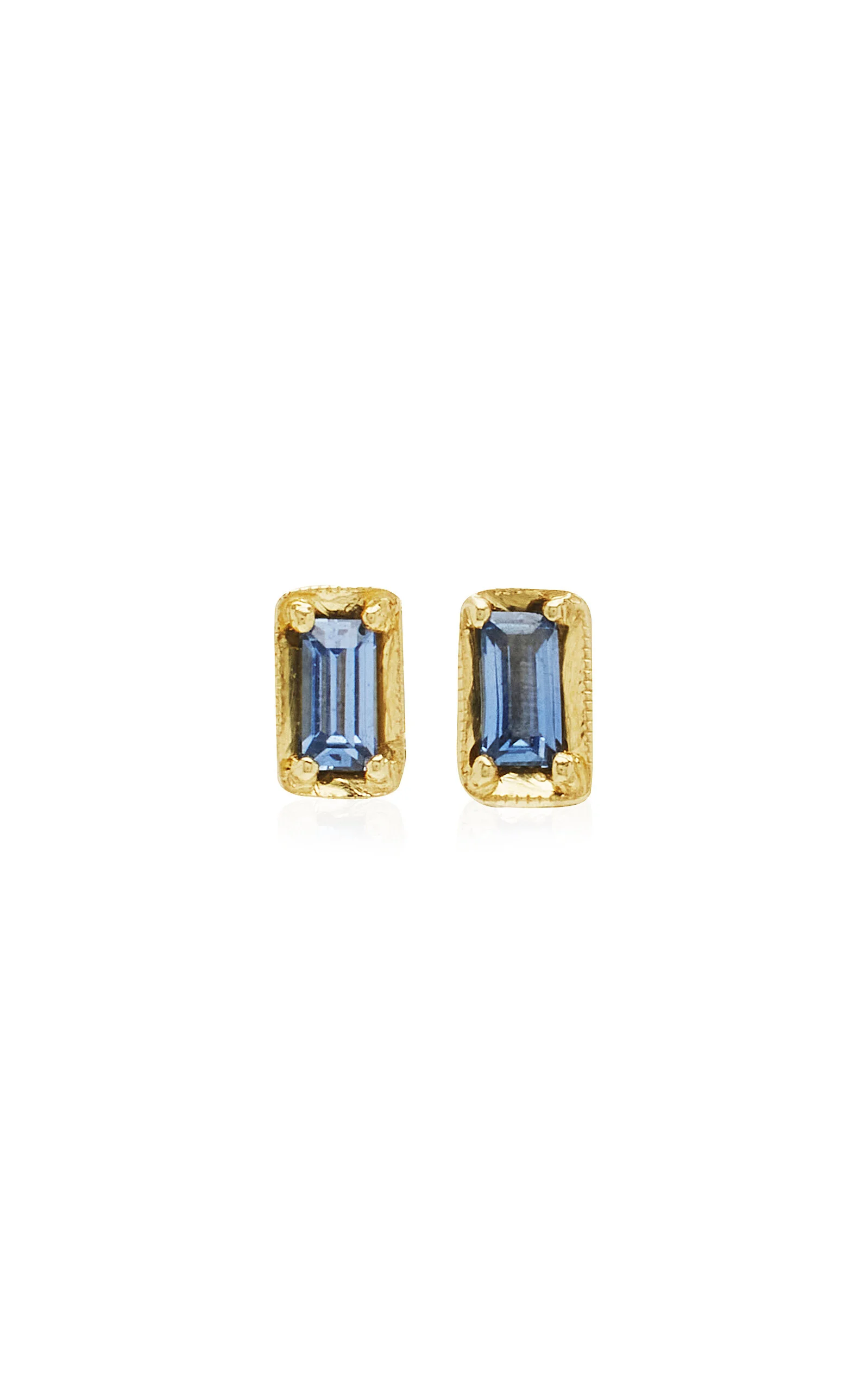 The designer's behind ILA trace their roots in jewelry back to their ancestral homeland in the north western deserts of India — a place enchanted by history, mysticism and beauty and is where the edifices of their family lineage still stand today. Carved with the most skilled hand, each piece tells the stories of mythology of the land. PRODUCT DETAILS - Not eligible for expedited shipping - Post fastening for pierced ears - Composition: 14k sustainable yellow gold, 0.27ct baguette-cut blue sapphires - Made in the USA - Please note the possibility of natural inclusions in gemstones SIZE & FIT - Dimensions: 3.5 x 6.3mm
