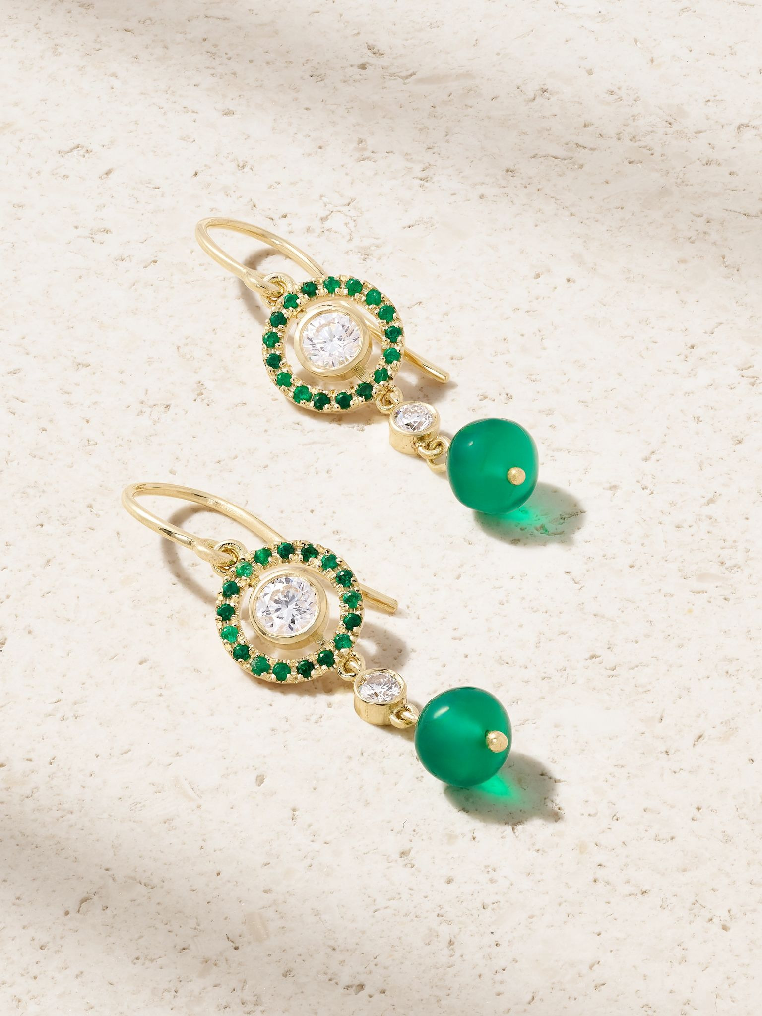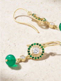 Ileana Makri's 'Orbit' earrings are truly out of this world. Handmade from 18-karat gold, they're strung with two sparkling diamonds, each framed by a halo of vibrant emeralds, and have smooth green onyx beads that anchor the design. The colors will really make hazel or brown eyes pop. Details & Care - Green onyx, total weight: 1.65-carats; round-cut G VS-SI diamonds, total weight: 0.59-carats; emeralds, total weight: 0.23-carats - Hook fastening for pierced ears - This piece has been certified in accordance with the Hallmarking Act 1973