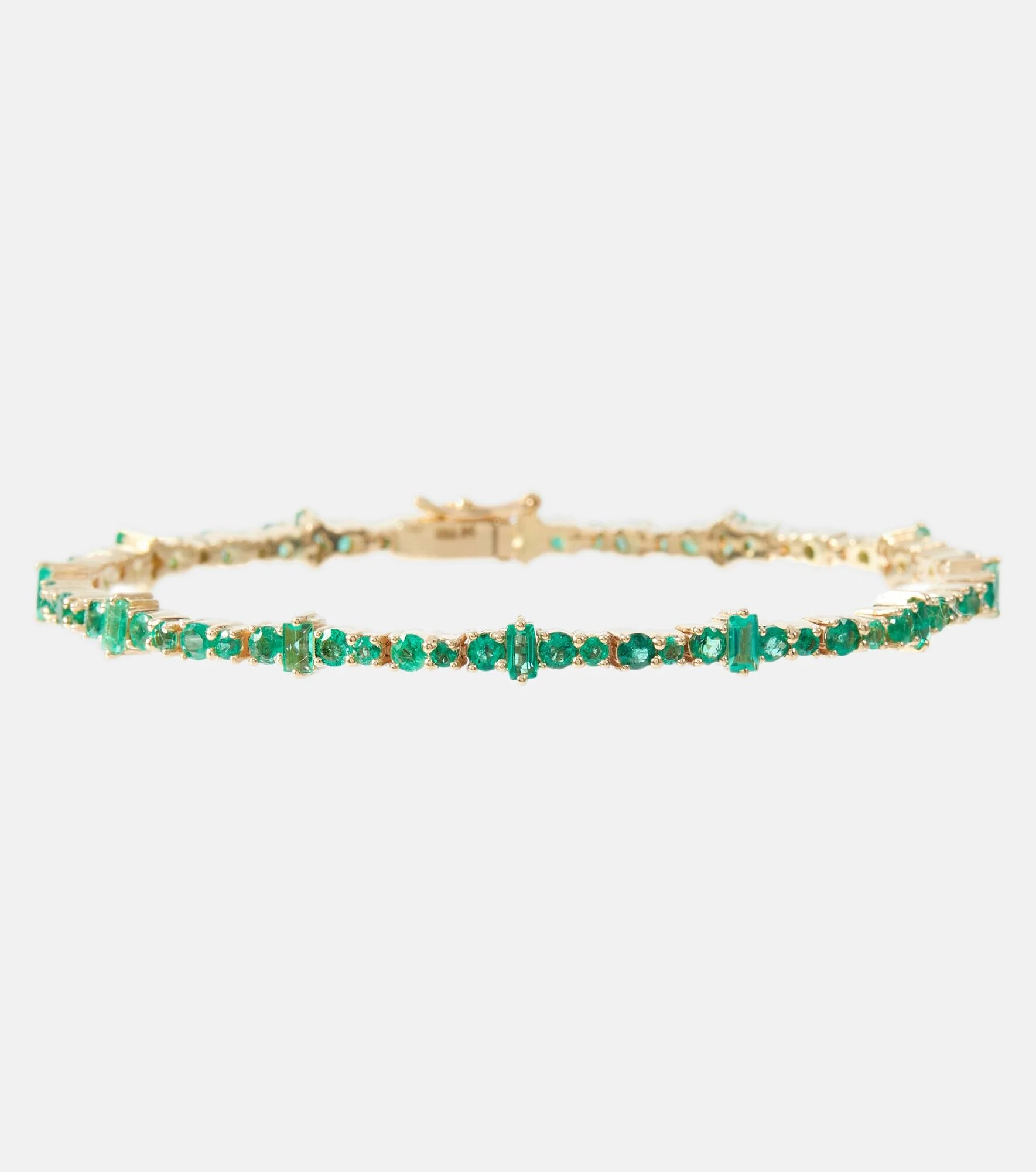 The dainty Rivulet bracelet from Ileana Makri is made from 18kt yellow gold. It's encrusted with round-cut and baguette-cut emeralds in a prong setting and fastens with a push clasp. Product Details - Material: 18kt yellow gold - Stone I: emerald, round-cut, baguette-cut, prong setting - Closure: clasp fastening - Made in Greece - Designer color name: Yellow Gold - Item number: P00643350 Size & Fit - Length when open 18,5cm-7.5" - Max. width 5mm-0.2"