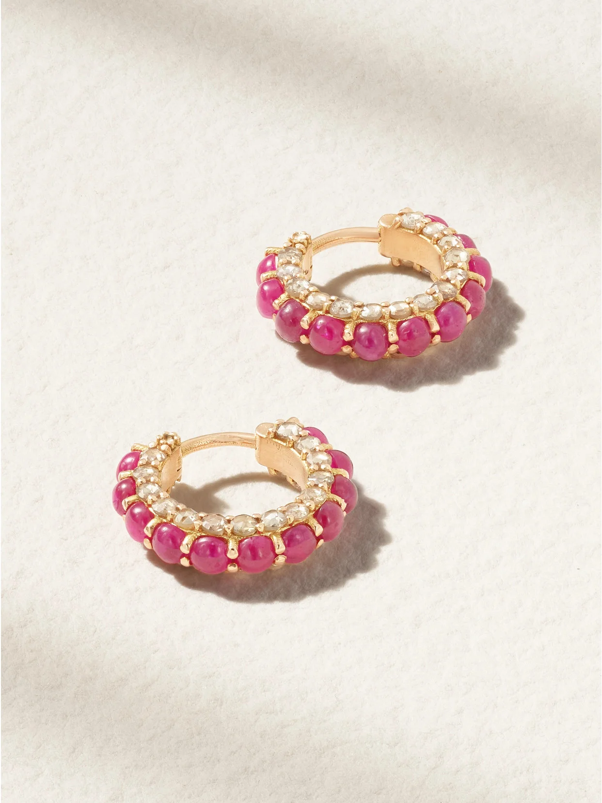 Ileana Makri's earrings are decorated with vibrant pink rubies illuminated by sparkling cream diamonds on either side of the classic hoop shape. They're handmade from 18-karat rose gold and perfectly sized for everyday wear, though they'll also look beautiful for evening events.