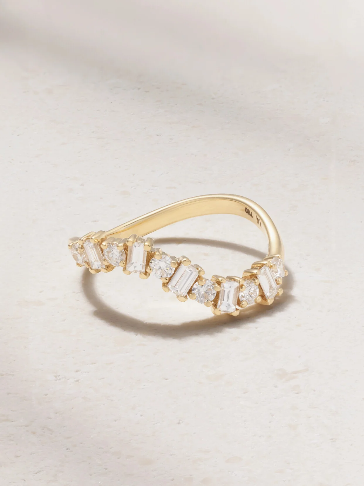 Ileana Makri's 'Wave' ring is so named after its rippling silhouette. Handmade from 18-karat white gold, it's set with 0.67-carats of alternating emerald and round-cut diamonds. Wear it solo or stacked under your engagement ring.