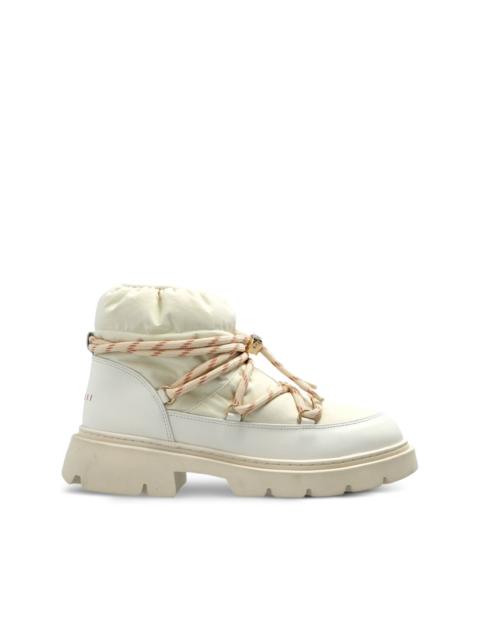Biker Puffer boots Highlights - Beige - Padded collar - Front lace-up fastening - Ridged rubber sole - Ankle height Imported Composition Outer: Polyester 100%, Leather 100% Lining: Wool 100% Sole: Rubber 100%