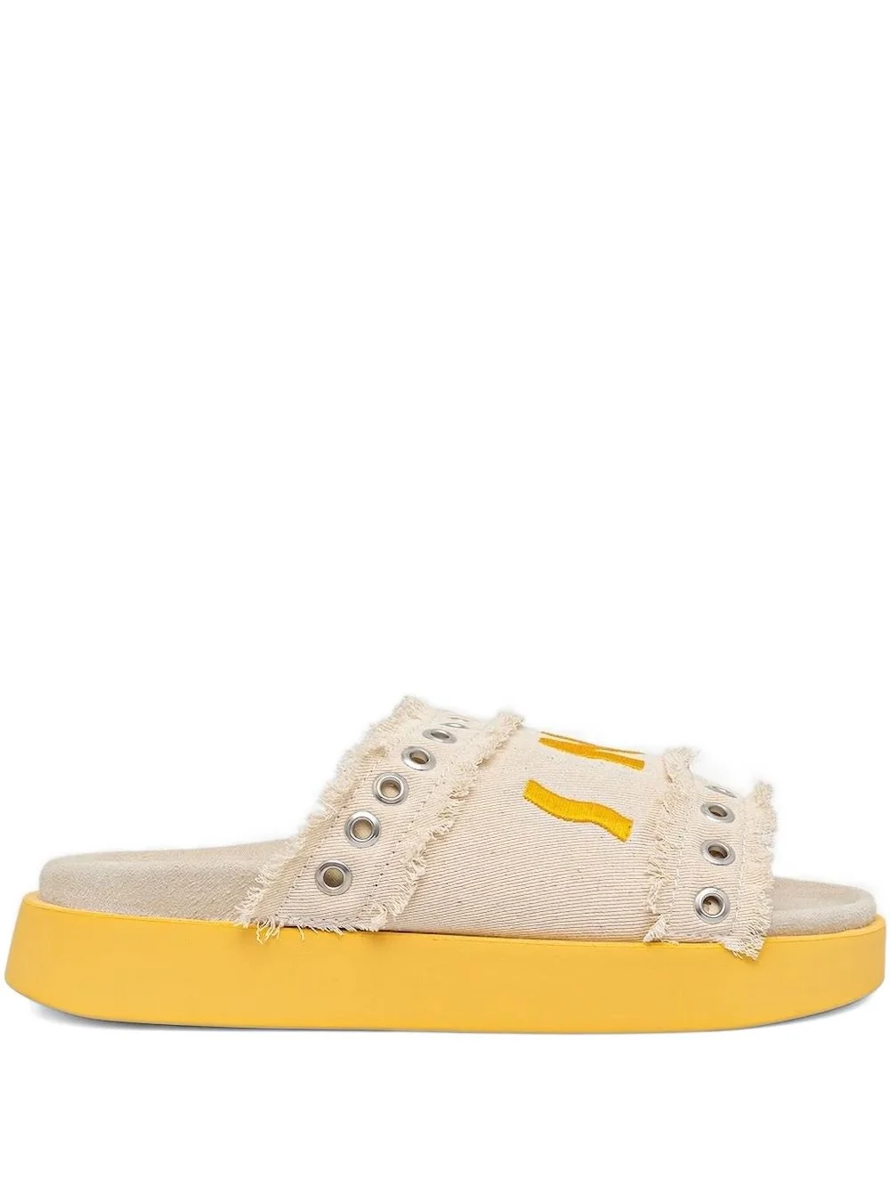 frayed-embellished flat sandals Highlights - Cream - Frayed edges - Embroidered logo - Eyelets - Platform sole - Flat sole Imported Composition Sole: Rubber 100% Outer: Fabric 100% Lining: Calf Leather 100%