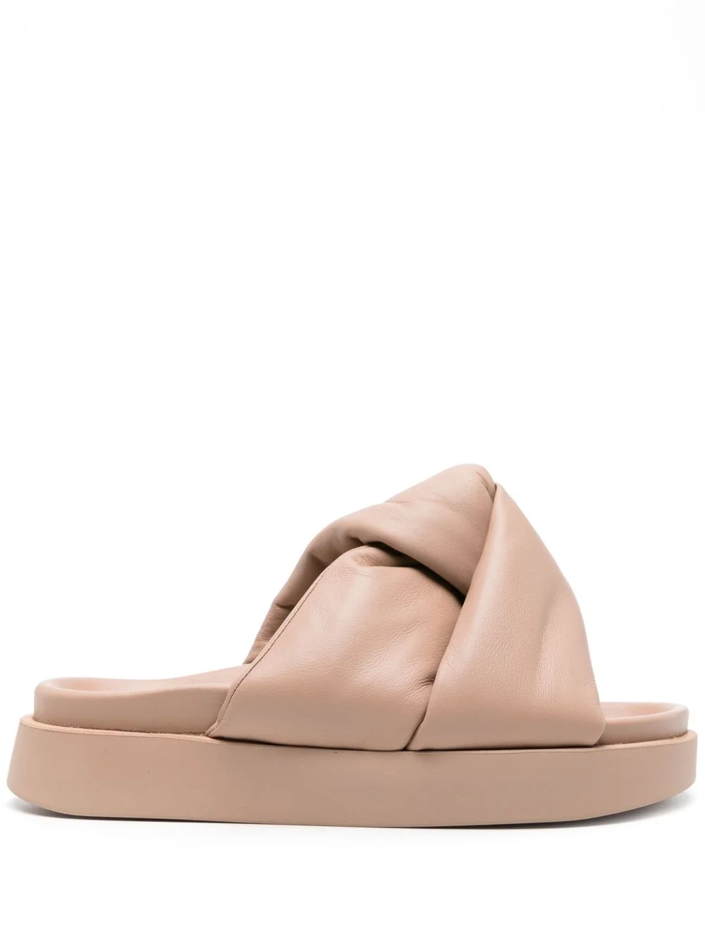 Soft Crossed leather slides Highlights - Blush beige - Calf leather - Grained texture - Knot detailing - Round open toe - Branded leather footbed - Flat rubber sole - Slip-on style Imported Composition Outer: Calf Leather 100% Lining: Calf Leather 100% Sole: Rubber 100% SIZE & FIT Measurement HEEL 1.37 in(3.5 cm) Sole height 1.18 in(3 cm)