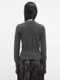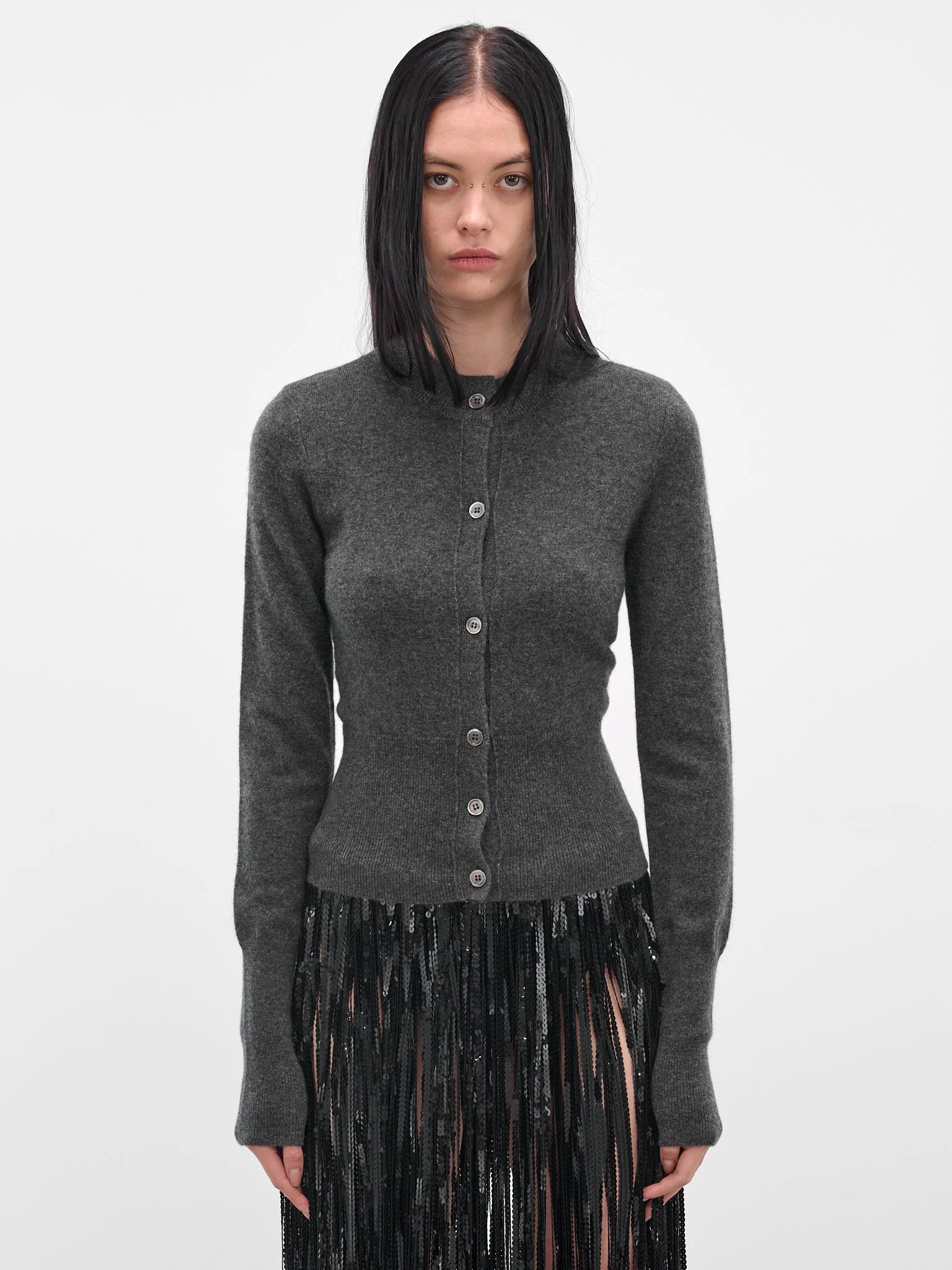 Gray cashmere cardigan with ribbed crewneck. Completed with front button placket and rib-knit trims. Featuring: • Slim fit • Ribbed crewneck • Long sleeves • Front button placket closure • Rib-knit cuffs and hem • Made in China • 100% Cashmere • Standard sizing Model is 5'8" wearing size S. Bust: 28.5" Waist: 22.5" Hips: 33.5"
