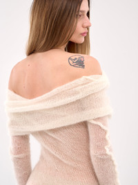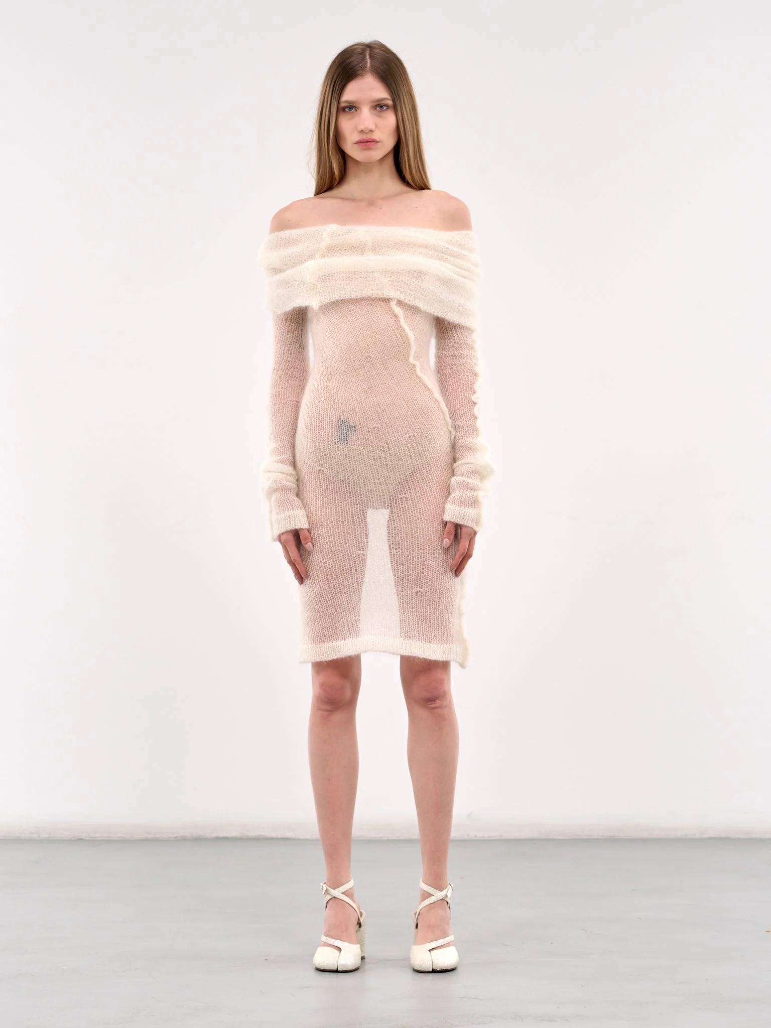 IOANNES dress in cream, paneled mohair-silk knit construction, sheer, off-shoulder, straight neckline, draped neck & shoulders, elongated sleeves, straight hem, mini-length, slim fit. Made in UK 70% Mohair 30% Silk Standard Sizing Model is 5'9" wearing size S. Bust: 32" Waist: 23" Hips: 34"