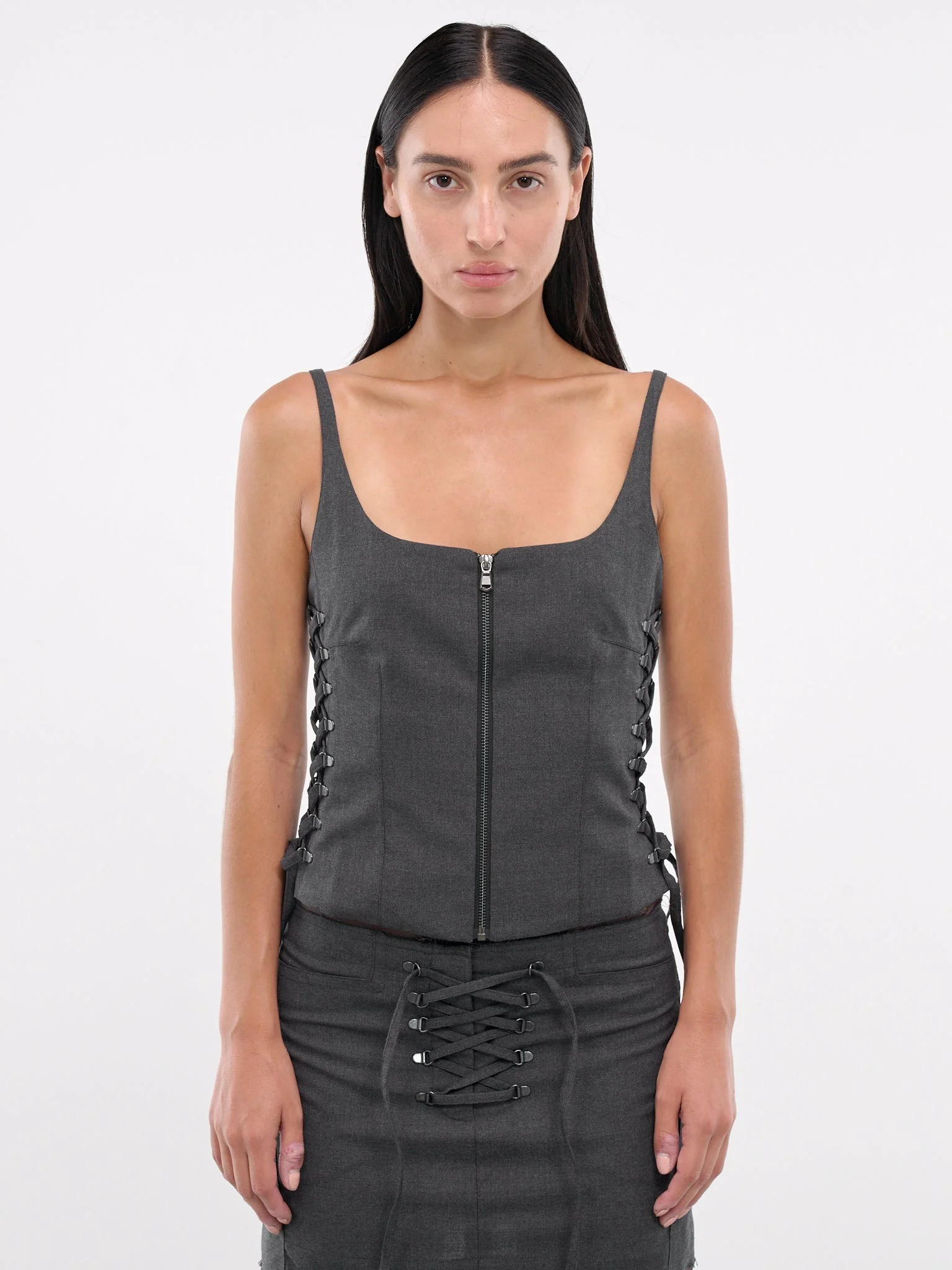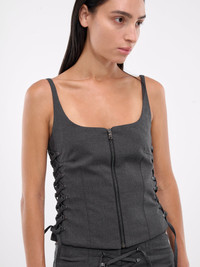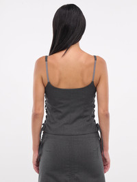 IOANNES tank in asphalt, paneled wool construction, scoop neck, spaghetti straps, sleeveless, armscyes, side lace-up fastening, back exposed zip closure, curved hem, slim fit. Made in Bulgaria 100% Wool French Sizing