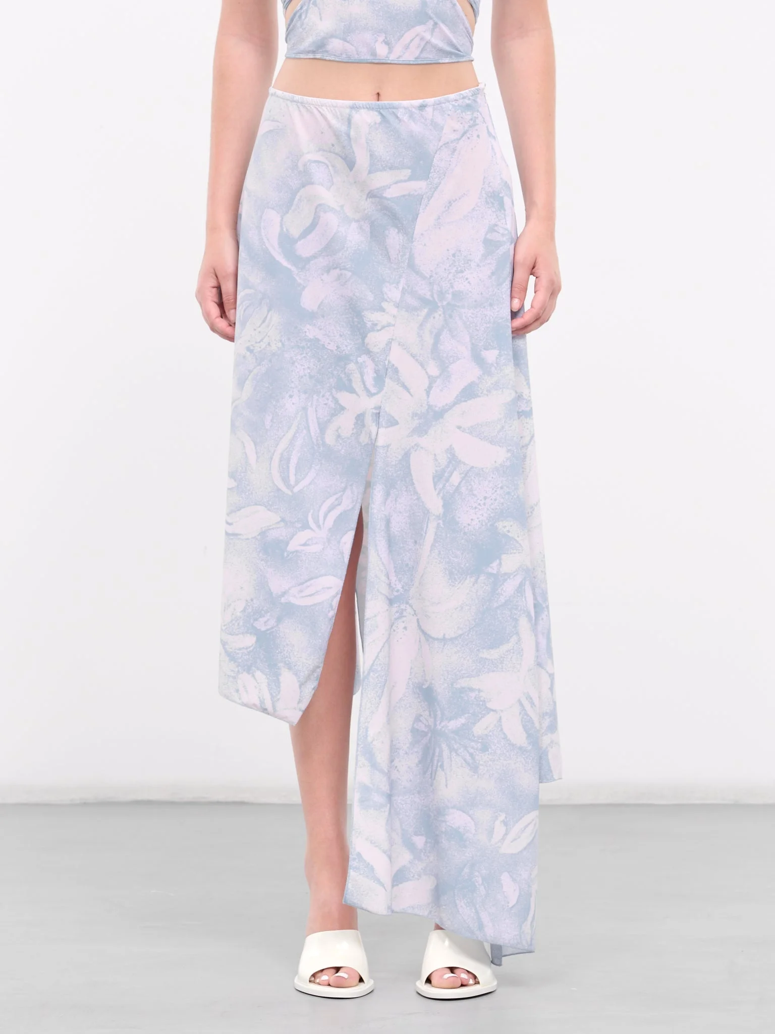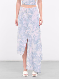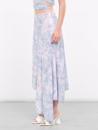IOANNES skirt in blue, shawl skirt design, paneled georgette construction, floral print, high-waisted, side concealed zip closure, front slit, asymmetric ruffled hem, midi-length, relaxed fit. Made in Italy Standard Sizing Model is 5'9" wearing size S. Bust: 32" Waist: 24" Hips: 34"