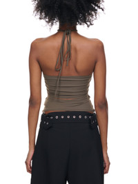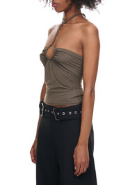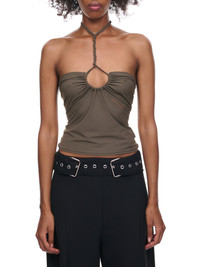 IOANNES top in green, stretch lycra, twisted halter neck tie fastening, sleeveless, center circle cut-out detail, sides & back slit, tonal topstitching, open back, fitted. Made in Italy Standard Sizing 100% Lycra Model is 5'8" wearing size XS. Bust: 32" Waist: 23" Hip: 34"