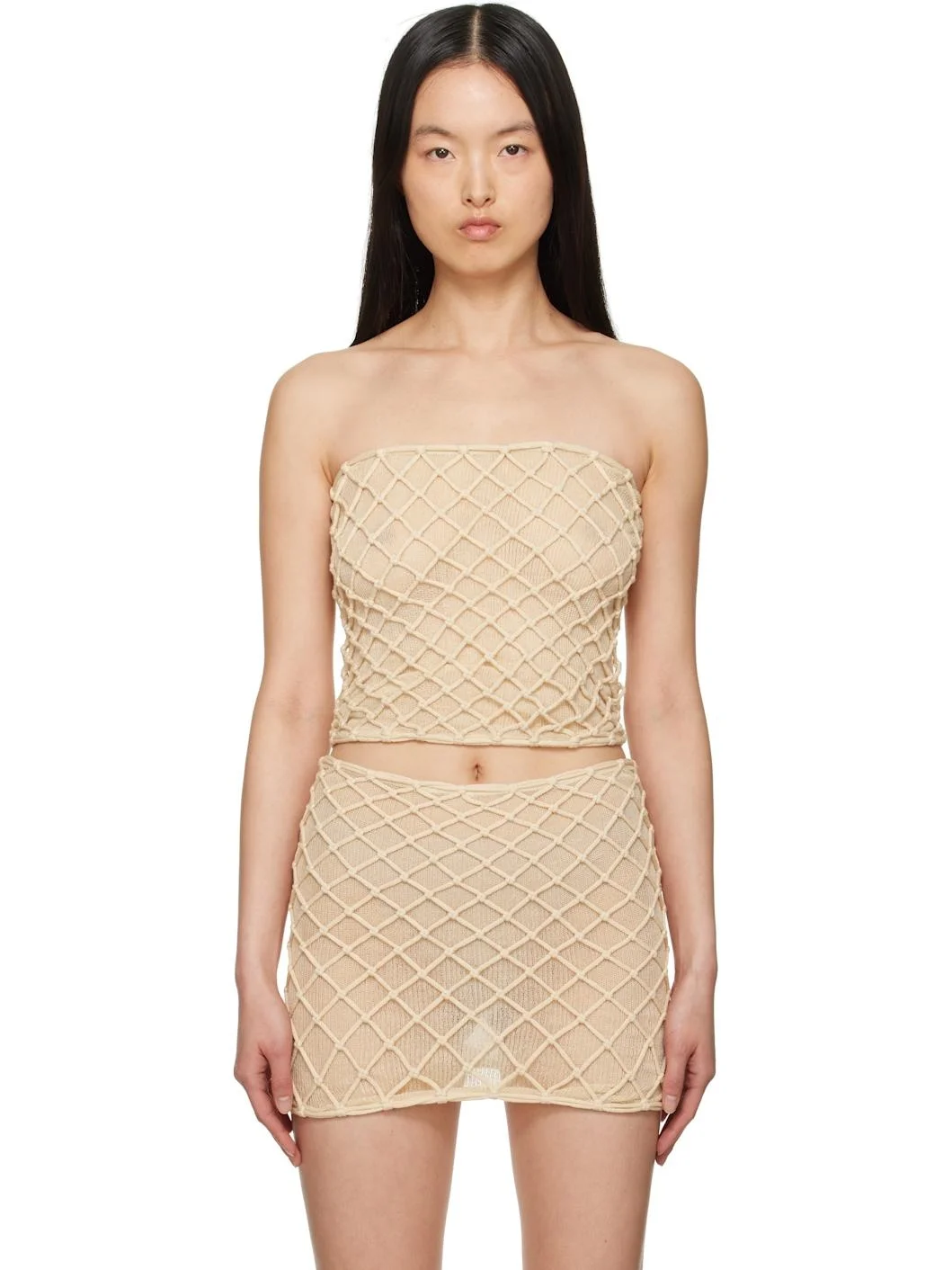Handcrafted semi-sheer knit and macrame stretch rayon tube top. · Can be worn as top or skirt · Elasticized straight neck Supplier color: Beige 90% polyester, 10% elastane. Made in Indonesia 251541F111007