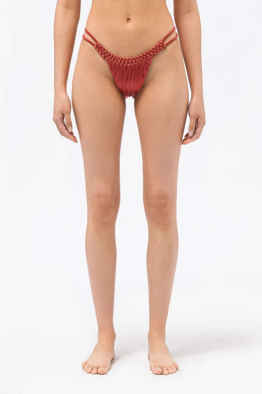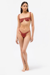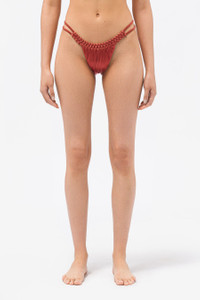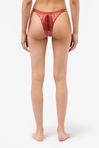 Isa Boulder women’s low rise, standard fit “Cherry” red stretch nylon satin jersey bikini bottom. Features an elasticized waist, woven trim, and a fully nylon jersey lining. Fit - Low rise, standard fit - US women’s sizing - Runs true to size - We recommend your regular size Feature - Elasticized waist - Woven trim - Cut-out details on the hips - High-cut leg openings - Fully lined in tonal stretch nylon jersey Fabrication - Material: 75% nylon, 25% elastane - Lining: 90% polyamide, 10% elastane - Made in Indonesia SKU: RS23SB2-CHER-M