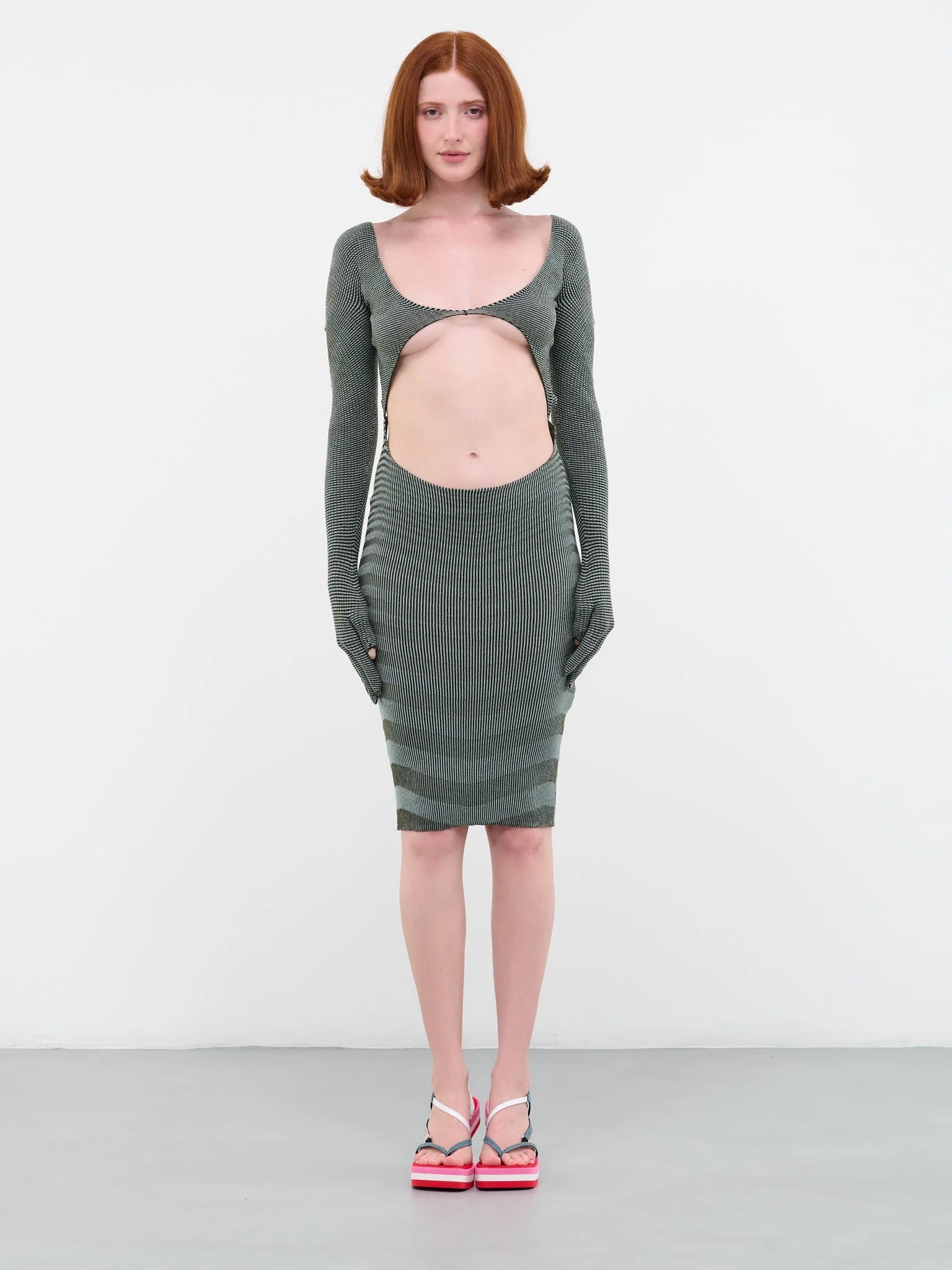 ISA BOULDER dress in green, one-of-a-kind, hand-made, stretch knit construction, stripe pattern, front & back cut-outs, low scoop neckline, gloved long sleeves, thumb slit, midi length, fitted. Made in Indonesia Standard Sizing Model is 5'7" wearing size S. Bust: 32" Waist: 25" Hip: 37"
