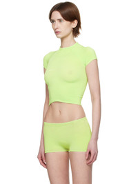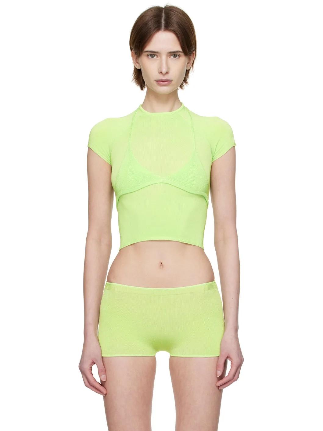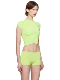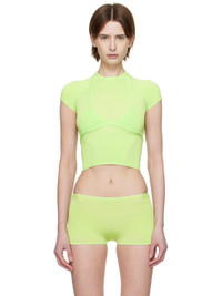 Handcrafted knit stretch rayon bra. · V-neck · Rib-knit hem · Self-tie halter straps Handcrafted knit stretch rayon T-shirt. · Rib-knit cowl neck, hem, and cuffs · Cap sleeves · Logo patch at back hem Supplier color: Mint 90% rayon, 10% elastane. Made in Indonesia 251541F110002