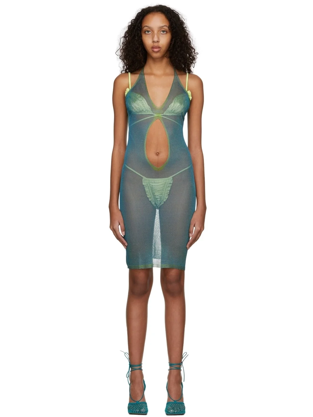 Sleeveless sheer knit short dress in tones of green and blue. · Cut-out at chest · Self-tie halter strap Supplier color: Beetle 100% rayon. Made in Indonesia 221541F054085