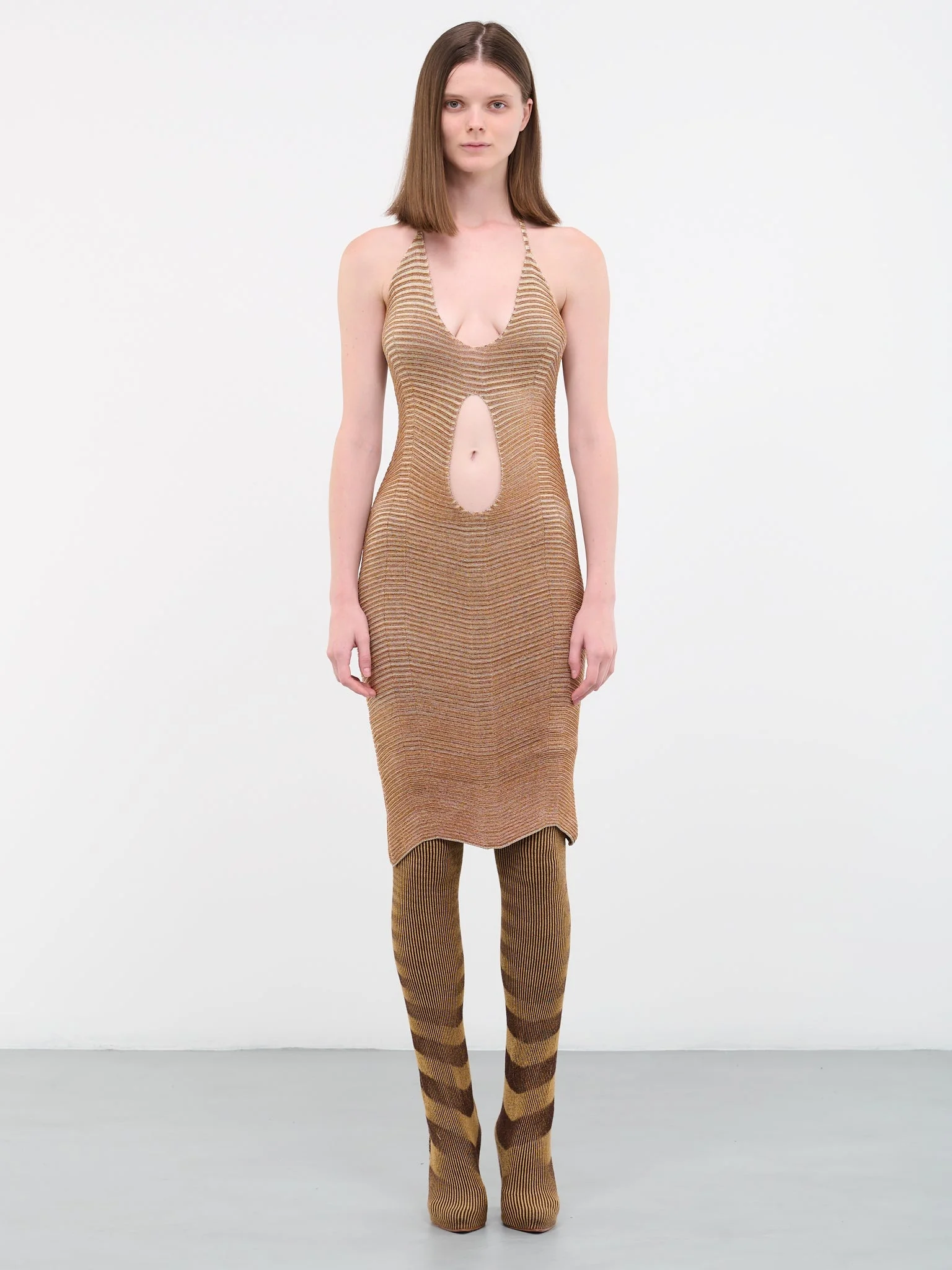 ISA BOULDER dress in brown, one-of-a-kind, hand-made, stretch knit construction, stripe pattern, halter neck, self-tie fastening, plunging scoop neck, keyhole cut-out, open back, waved hem, midi length, fitted. Made in Indonesia Standard Sizing Model is 5'7" wearing size S. Bust: 32" Waist: 25" Hip: 37"