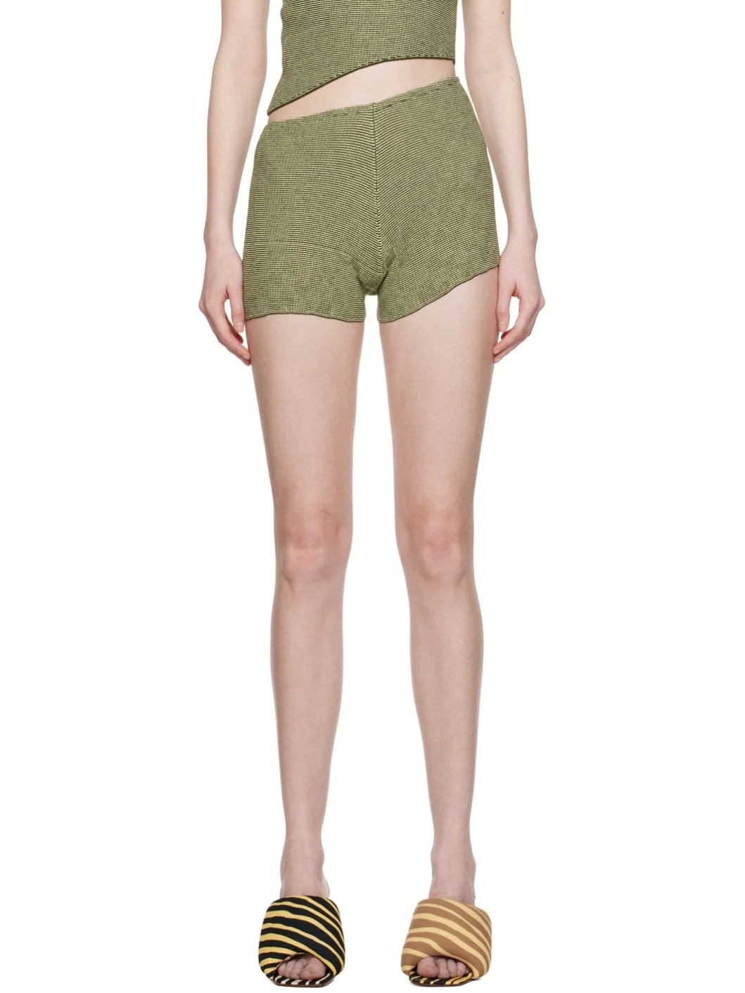 Handcrafted rib knit stretch acrylic shorts. · Lenticular jacquard check pattern throughout · Elasticized waistband Each item is unique. Please note that finishings may vary. Supplier color: Juice 90% acrylic, 10% elastane. Made in Indonesia 231541F088011