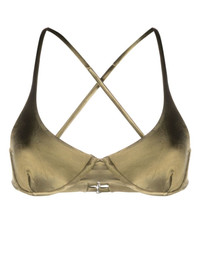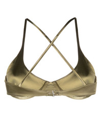 reversible crossover-strap bikini top Highlights - Olive green - Stretch-design - Satin finish - Balconette style - Rear hook and eye fastening - Rear criss-cross straps - Be mindful to try on swimwear over your own garments. Imported Composition Lining: Spandex/Elastane 10%