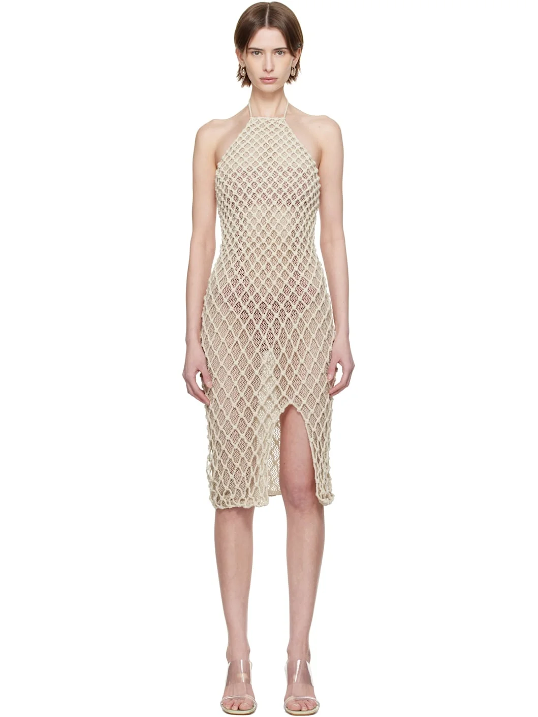 Handcrafted open-knit cotton midi dress. · Vent at front hem · Self-tie halter strap · Open back · Logo patch at back hem · Full mesh lining Wholesale exclusivity at SSENSE. Supplier color: Beige/Beige 100% cotton. Made in Indonesia 251541F052005