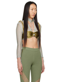 Open knit rayon cardigan. Laddering and lace-up detailing throughout. · Self-tie fastening at stand collar · Plunging V-neck · Button closure · Cropped hem Available exclusively at SSENSE. Supplier color: Lilac 100% rayon. Made in Indonesia 241541F100000