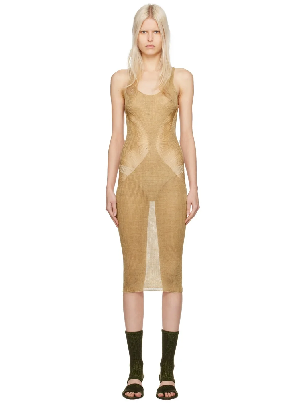 Semi-sheer rib knit rayon dress. Laddering throughout. · Scoop neck · Fixed shoulder straps · Unlined Wholesale exclusivity at SSENSE. Supplier color: Gold 100% rayon. Made in Indonesia 241541F054007