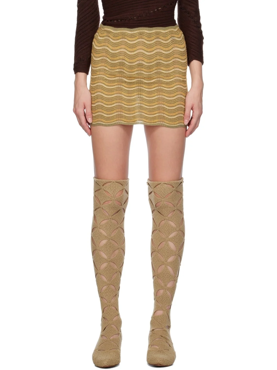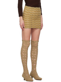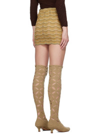 Handcrafted open knit stretch acrylic skirt. Stripes throughout. · Rib knit elasticized waistband and hem · Detachable brief-style underlay · Scalloped edge at hem Available exclusively at SSENSE. Supplier color: Burlap orange 90% acrylic, 10% elastane. Made in Indonesia 232541F090003