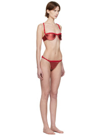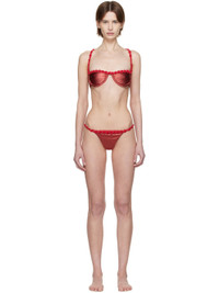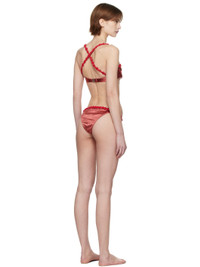 Stretch nylon sateen bikini top. Braided trim throughout. · Straight neck · Ruching and underwire at cups · Crisscrossing shoulder straps · Logo-engraved clasp closure at back · Fully lined Stretch nylon jersey bikini bottoms. · Braided trim at elasticized waistband · Fully lined Available exclusively at SSENSE. Supplier color: Cherry red Body: 75% nylon, 25% elastane. Lining: 90% nylon, 10% elastane. Made in Indonesia 251541F105000