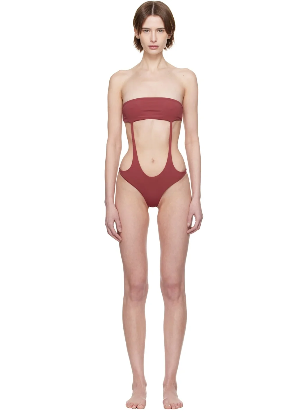 ECONYL® stretch recycled nylon jersey one-piece swimsuit. · Strapless construction · Straight neck · Cutout at waist · Tab-slot fastening at open back · Fully lined · Logo-engraved silver-tone hardware Wholesale exclusivity at SSENSE. Supplier color: Chilli Body: 78% recycled nylon, 22% elastane. Lining: 90% polyester, 10% elastane. Made in Indonesia 251541F103002