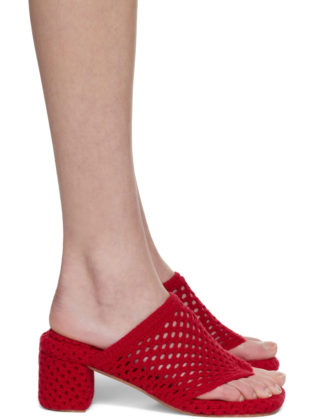 Open-knit heeled sandals in red. · Open square toe · Elasticized thong-style strap at vamp · Logo patch at footbed · Covered block heel · Leather sole · Heel: H2.75" Wholesale exclusivity at SSENSE. Supplier color: Cherry red Upper: textile. Sole: leather. Made in Indonesia 251541F125000