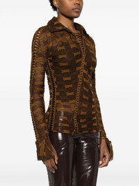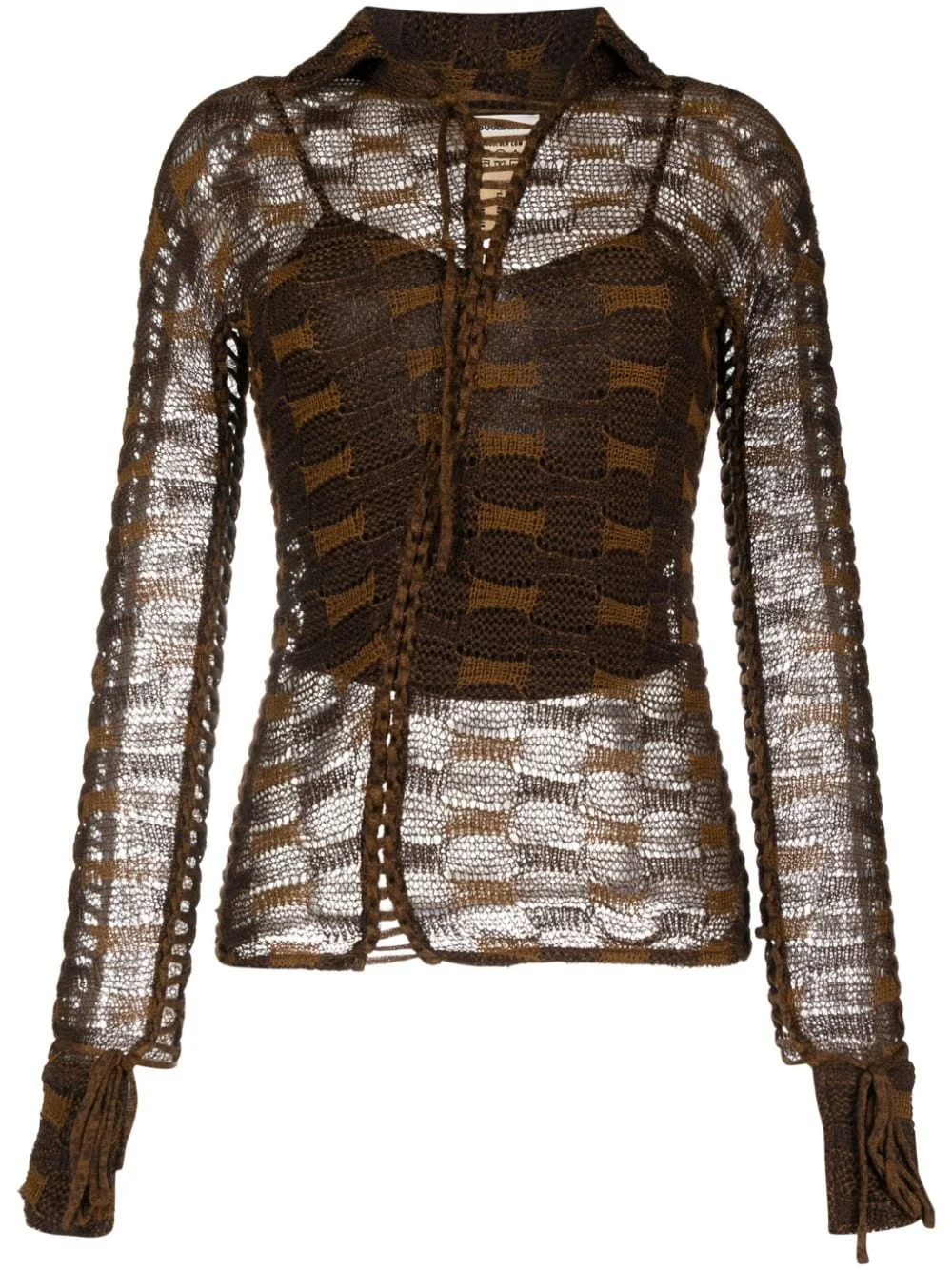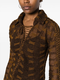 tie-fastening knitted shirt Highlights - Coffee brown/cognac brown - Knitted construction - Open knit - Spread collar - Front tie fastening - Long sleeves - Straight hem Imported Composition Rayon 100% SIZE & FIT Model measurements Height 5 ft 11 in(1.8 m) Bust/Chest 31.49 in(80 cm) Hips 36.61 in(93 cm) Waist 24.4 in(62 cm) FittingInformation Designed for a close fit throughout The detachable slip sits just away from the body, offering a close yet comfortable fit Made with a midweight knit, this piece offers some stretch This piece's size conversion is based on body measurements; for help with this item's sizing, refer to our Size & Fit Guide Washing instructions Dry Clean Only