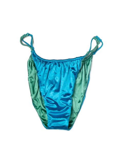 Swinger two-tone satin bikini bottom Highlights - Turquoise blue - Satin fabric - High-leg cut - Low-rise - Adjustable straps - Gathered detailing - Be mindful to try on swimwear over your own garments. Imported Composition Outer: Nylon 75%, Elastane 25% Lining: Polyester 90%, Elastane 10% Washing instructions Read Manufacturer Guidelines