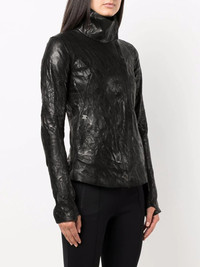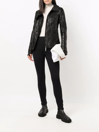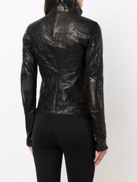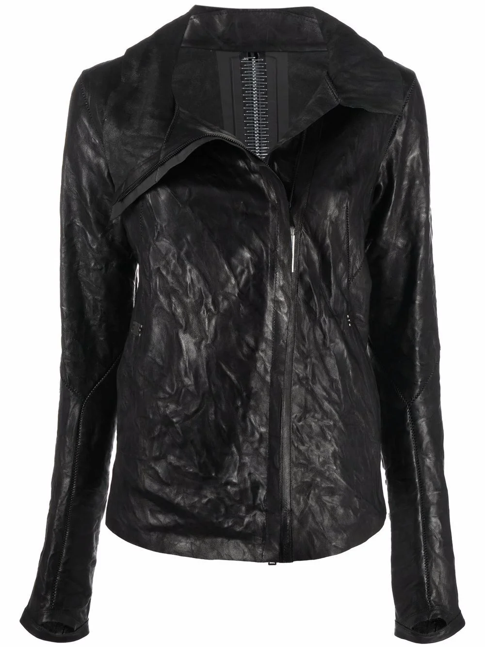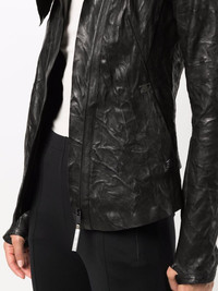 prudent leather jacket black leather off-centre front zip fastening long sleeves spread collar crinkled finish Made in France Composition Lamb Skin 100% SIZE & FIT Model measurements Height 5 ft 11 in(1.8 m) Bust/Chest 33.07 in(84 cm) Hips 37.4 in(95 cm) Waist 25.19 in(64 cm) FittingInformation This piece fits true to size. We recommend you get your regular size Cut for a slim fit Made from supple hide Washing instructions Specialist Cleaning