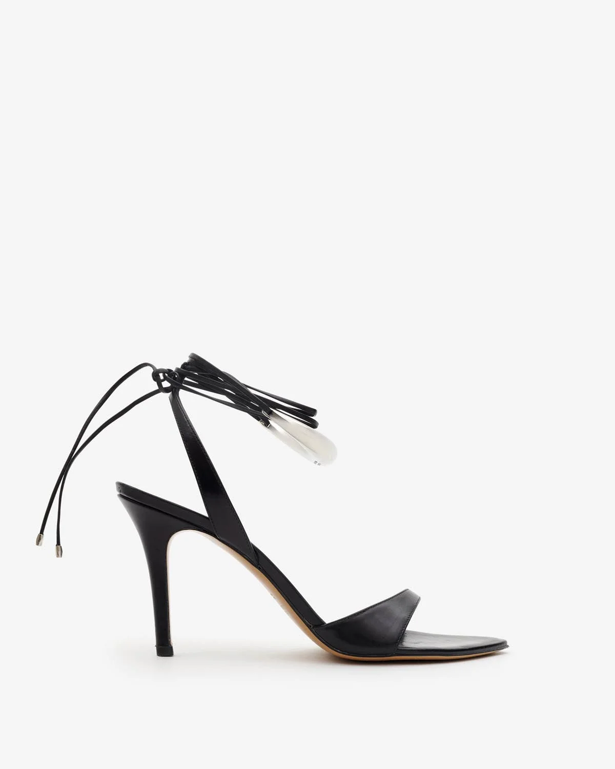 Sandals with round open toes Ankle ties Metal jewel near the ankles 9.5 cm (3.7 in.) heels Soft leather insoles and outsoles Style: SD0162FA-B2A04S YLUAN 100% calf leather Care & Sustainability the history and environmental impact of this product