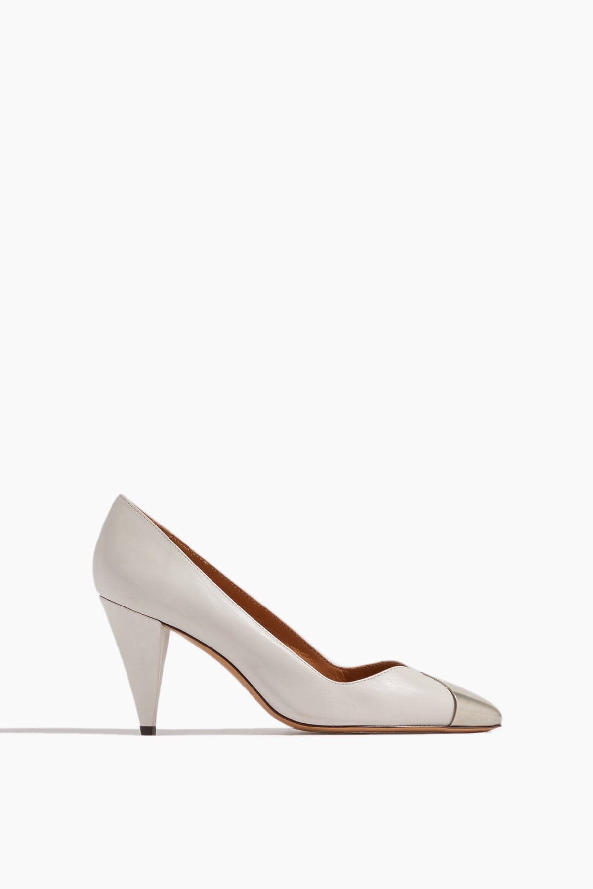 The Isabel Marant Palda Pointed Pump in White features calfskin leather with metallic contrasting toe insert. 3.1" Heel 100% Calfskin Leather