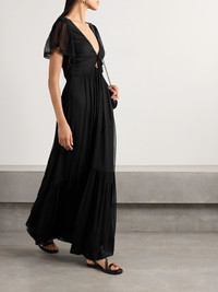 Imbued with the effortlessness and ease often associated with Parisian style, Isabel Marant designs clothes for women and their "real lives". Cut from silk-crepon, this 'Agathe' dress is designed with a cutout bodice framed by halterneck ties and fluttery sleeves then falls to a swishy tiered maxi skirt. Size & Fit - Fits true to size, take your normal size - Designed to be slightly fitted at the bust and waist, loose at the hip - Lightweight, non-stretchy fabric - Model is 177cm/ 5'10" and is wearing a FR 36 Details & Care - Black silk-crepon - Concealed zip fastening along side - 100% silk; lining: 100% viscose - Dry clean