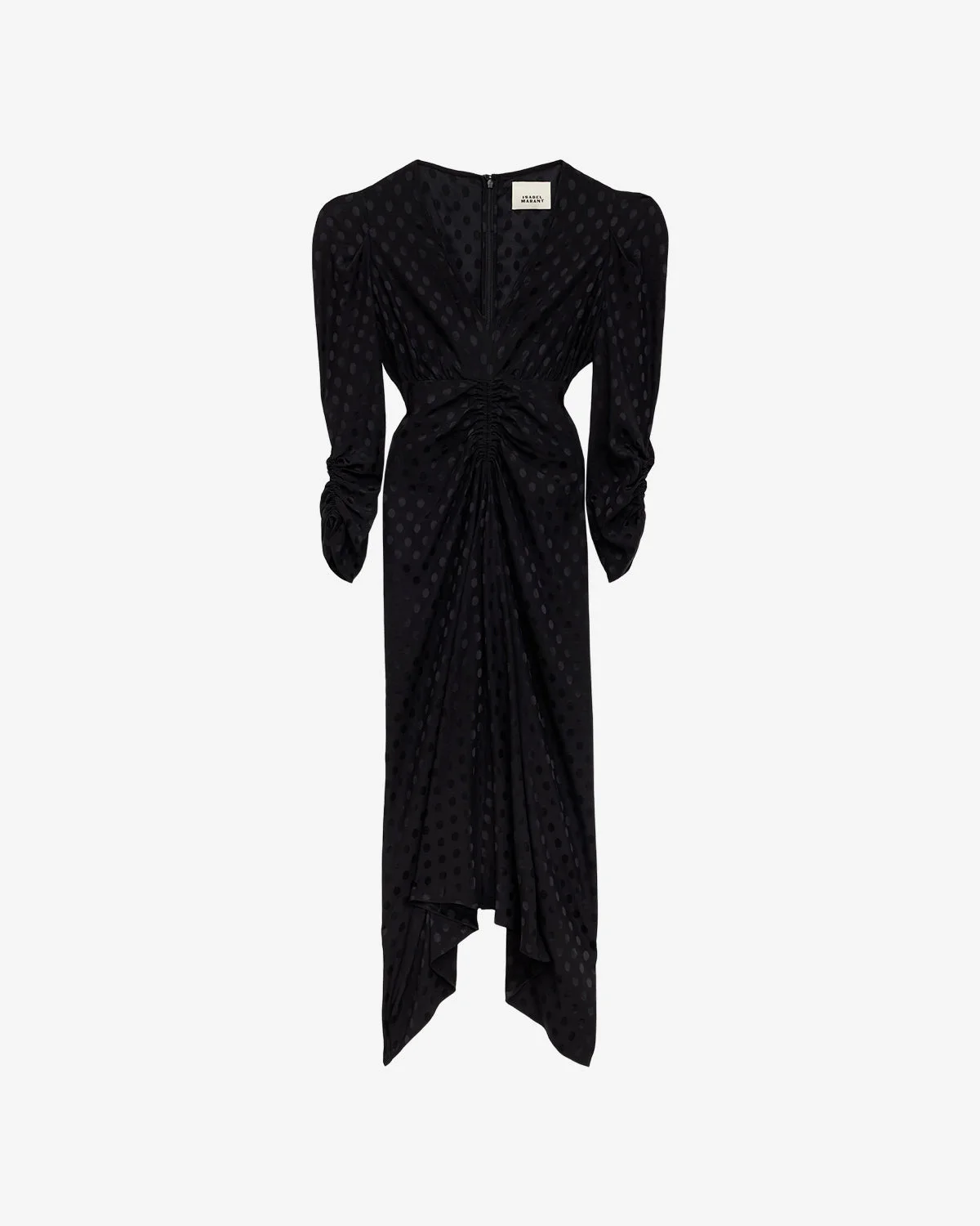 Long silk jacquard dress Low-cut V-neckline Long gathered pagoda sleeves Chest seam and asymmetrical length Flowing cut Style: RO0011FF-C4J04I ALBINI 90% silk, 10% elastane