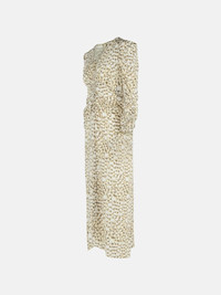Manufacture code: RO0011FA-C3J08I 23EC Retail code: RO0011FA-C3J08I 23EC Printed and curled silk blend midi dress with mosaic pattern, deep V-neck, structured shoulders with thin padding, '3/4' sleeves, draped and curled sleeves and waist, one button closure at the back and hidden zipper, asymmetrical hem, lightweight material with skirt lining, fluid cut, tight waistband Main: 91% silk, 9% elastane Made in Bulgaria